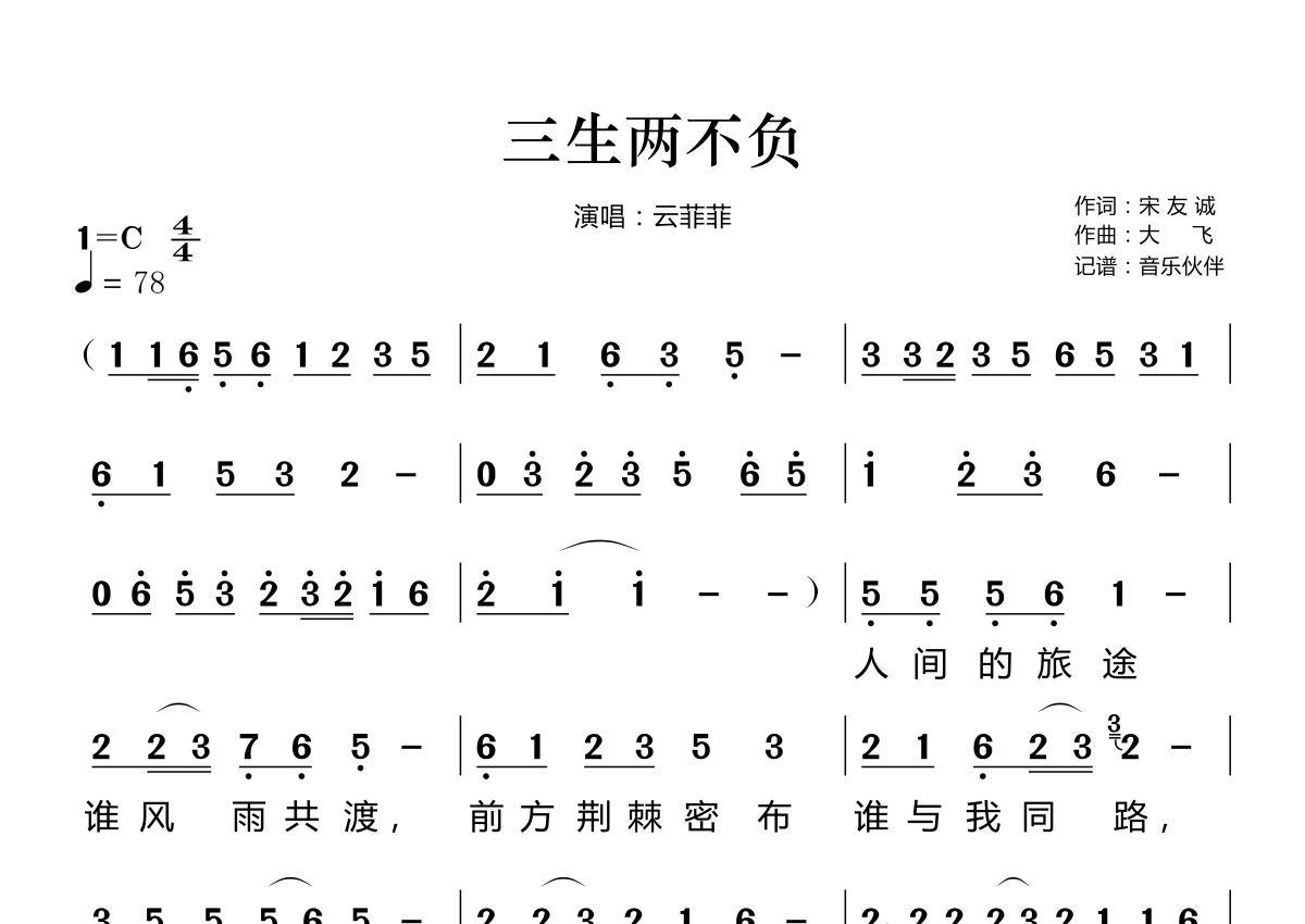 《三生两不负》是云菲菲演唱的一首歌曲,这份简谱共有两张高清图谱,图谱由 @音乐伙伴 编配上传。