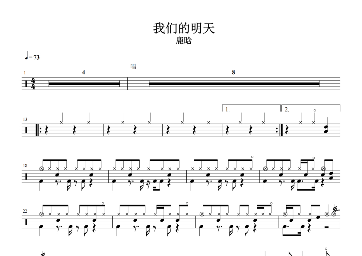 《我们的明天》是鹿晗演唱的一首歌曲,拍号为4/4拍,歌曲速度为每分钟73拍,这份架子鼓谱共有两张高清图谱,图谱由 @放晴的天空 编配上传,图谱使用五线谱编配,使用这份我们的明天架子鼓谱,你将能够轻松地敲打出这首鹿晗的我们的明天,快来尝试吧。