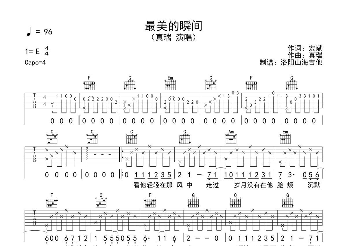 真瑞《最美的瞬间》吉他谱 - C调弹唱六线谱