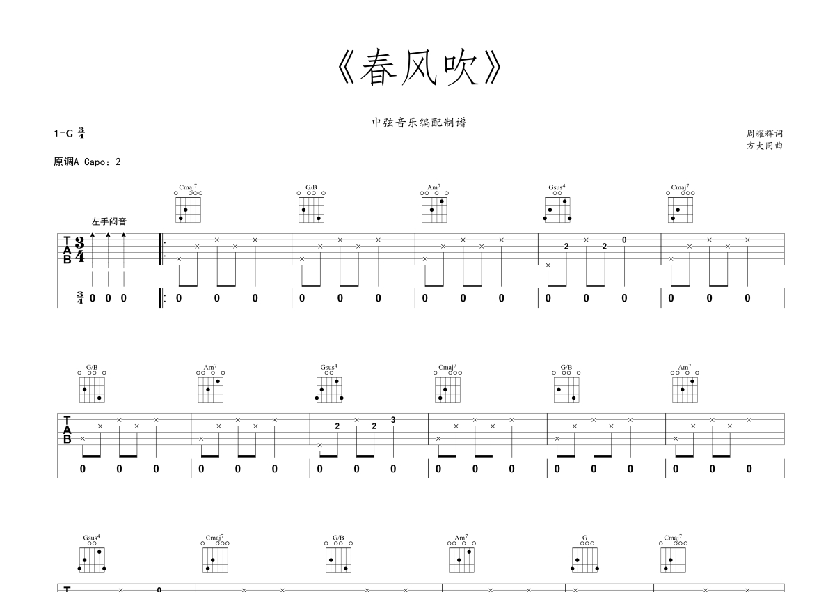 方大同《春风吹》吉他谱 - G调弹唱六线谱