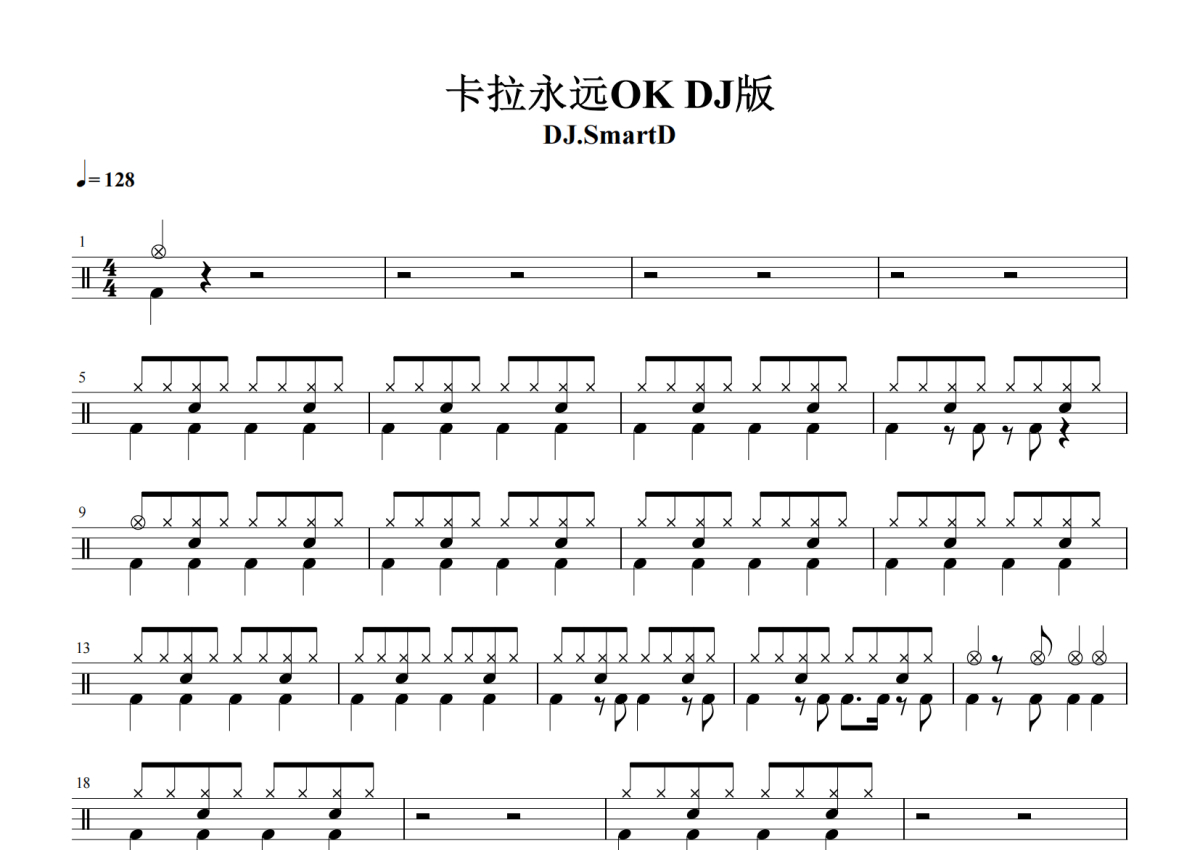 《卡拉永远OK》是DJ.SmartD演唱的一首歌曲,拍号为4/4拍,歌曲速度为每分钟128拍,这份架子鼓谱共有两张高清图谱,图谱由 @放晴的天空 编配上传,图谱使用五线谱编配,使用这份卡拉永远OK架子鼓谱,你将能够轻松地敲打出这首DJ.SmartD的卡拉永远OK,快来尝试吧。