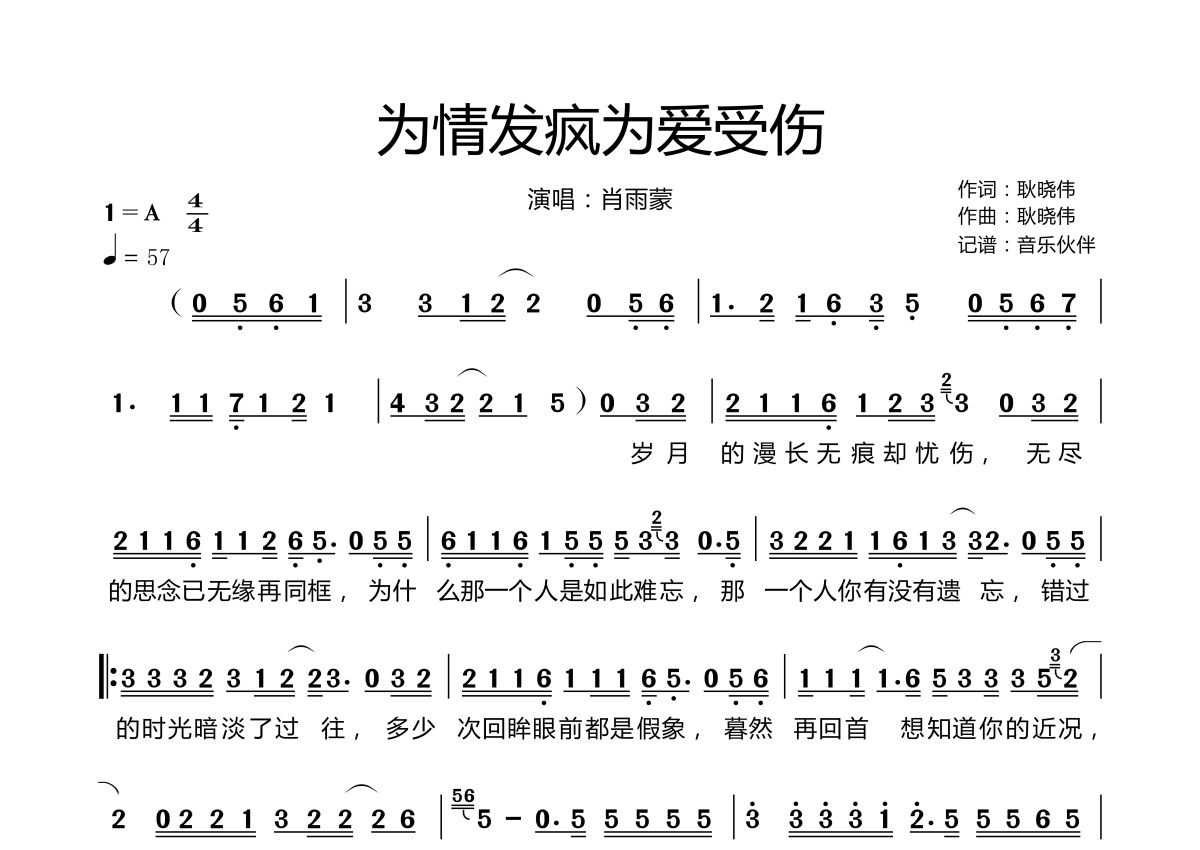 《为情发疯为爱受伤》是肖雨蒙演唱的一首歌曲,拍号为4/4拍,歌曲速度为每分钟57拍,这份简谱共有两张高清图谱,图谱由 @音乐伙伴 编配上传。