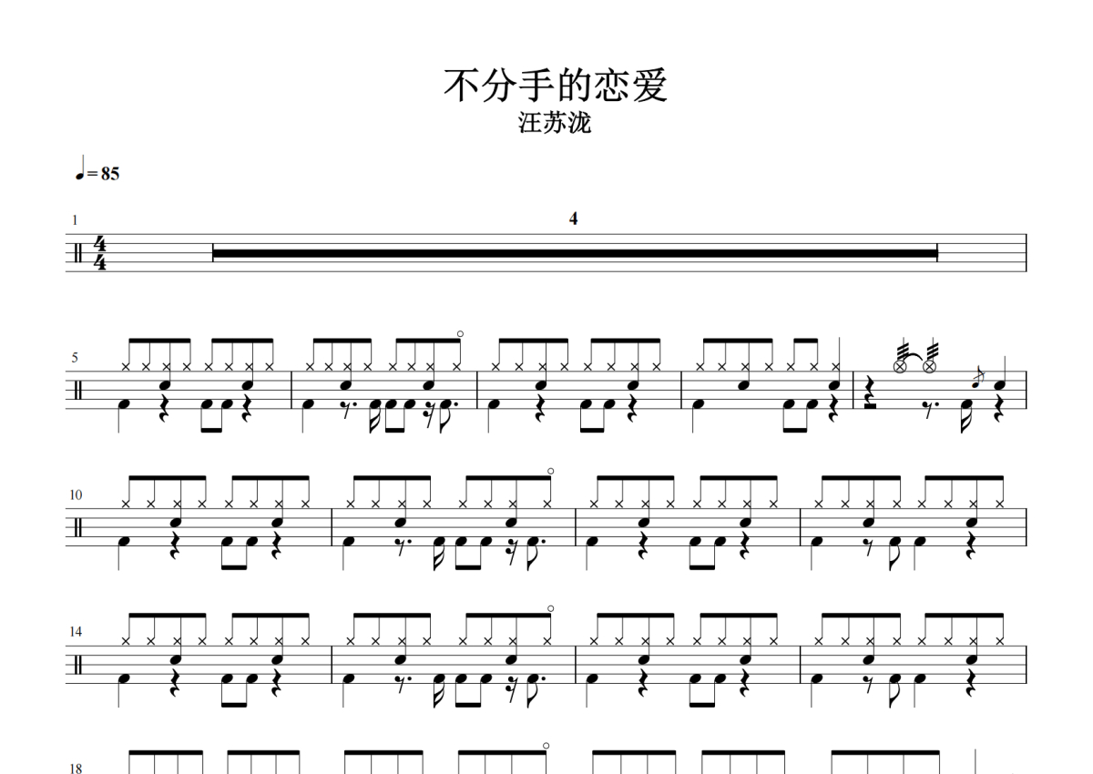 《不分手的恋爱》是汪苏泷演唱的一首歌曲,拍号为4/4拍,歌曲速度为每分钟85拍,这份架子鼓谱共有两张高清图谱,图谱由 @放晴的天空 编配上传,图谱使用五线谱编配,使用这份不分手的恋爱架子鼓谱,你将能够轻松地敲打出这首汪苏泷的不分手的恋爱,快来尝试吧。