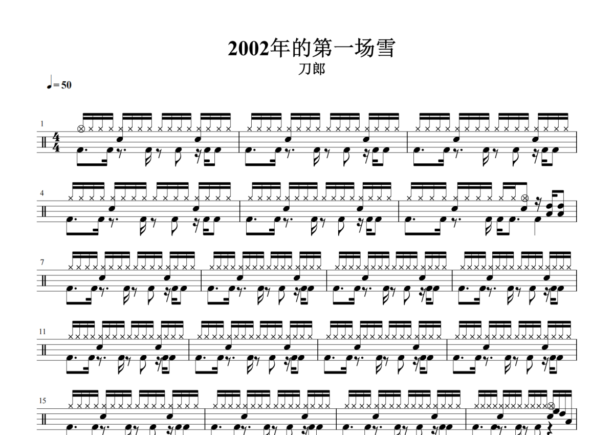 《2002年的第一场雪》是刀郎演唱的一首歌曲,拍号为4/4拍,歌曲速度为每分钟50拍,这份架子鼓谱共有两张高清图谱,图谱由 @放晴的天空 编配上传,图谱使用五线谱编配,使用这份2002年的第一场雪架子鼓谱,你将能够轻松地敲打出这首刀郎的2002年的第一场雪,快来尝试吧。