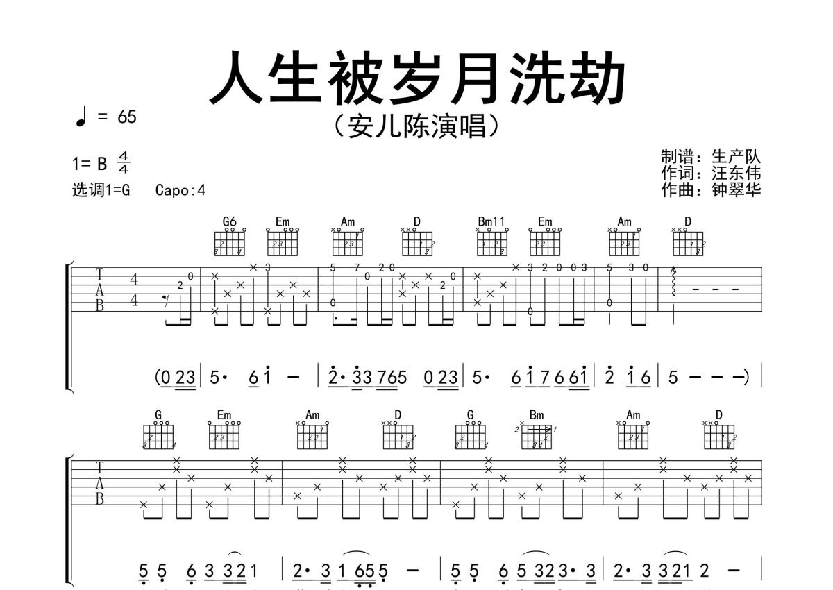 《人生被岁月洗劫》是安儿陈演唱的一首歌曲,精编完美版,拍号为4/4拍,歌曲速度为每分钟65拍,歌曲原调为B调,但由于原调指法比较难,为了方便弹奏,本吉他谱采用的是G调指法编配,变调夹4品弹奏即为原调,当然也可以根据自己的音域改变变调夹位置,或者通过改变和弦调性,以方便自己弹奏,这份吉他谱共有三张高清图谱,图谱由 @生产队 编配上传,图谱使用六线谱编配,包含吉他和弦指法、简谱以及歌词部分,使用这份人生被岁月洗劫吉他谱,可以让你更加方便地掌握这首歌曲的弹唱技巧,快来尝试吧。安儿陈演唱的歌曲《人生被岁月洗劫》原版吉他谱,完整的前奏、间奏、尾奏solo编配,精编完美版,值得推荐!。