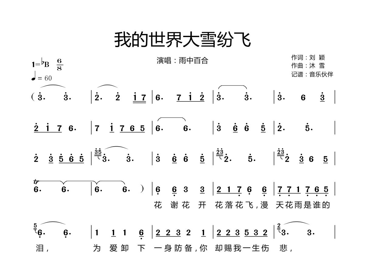 《我的世界大雪纷飞》是雨中百合演唱的一首歌曲,拍号为6/8拍,歌曲速度为每分钟60拍,这份简谱共有两张高清图谱,图谱由 @音乐伙伴 编配上传。