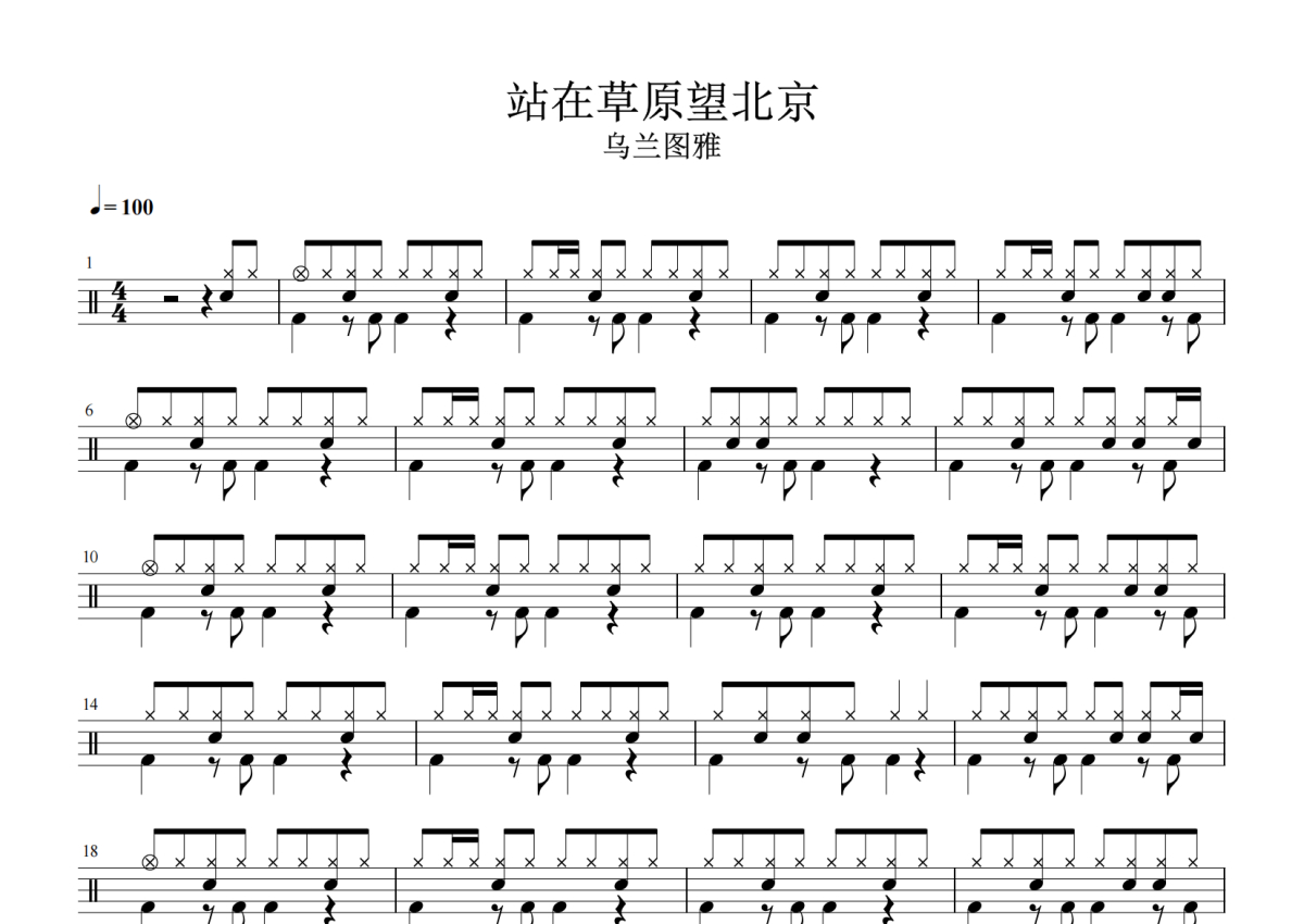 《站在草原望北京》是乌兰图雅演唱的一首歌曲,拍号为4/4拍,歌曲速度为每分钟100拍,这份架子鼓谱共有三张高清图谱,图谱由 @放晴的天空 编配上传,图谱使用五线谱编配,使用这份站在草原望北京架子鼓谱,你将能够轻松地敲打出这首乌兰图雅的站在草原望北京,快来尝试吧。