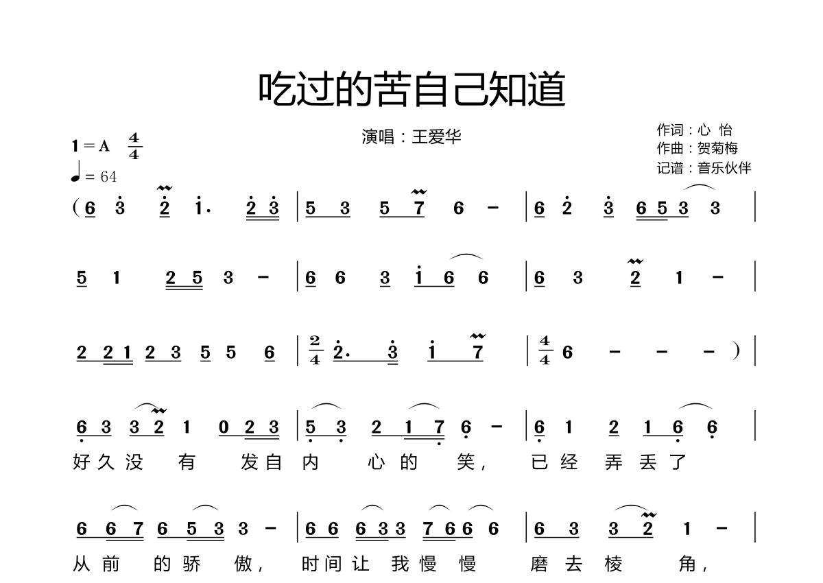 《吃过的苦自己知道》是王爱华演唱的一首歌曲,拍号为4/4拍,歌曲速度为每分钟64拍,这份简谱共有两张高清图谱,图谱由 @音乐伙伴 编配上传。