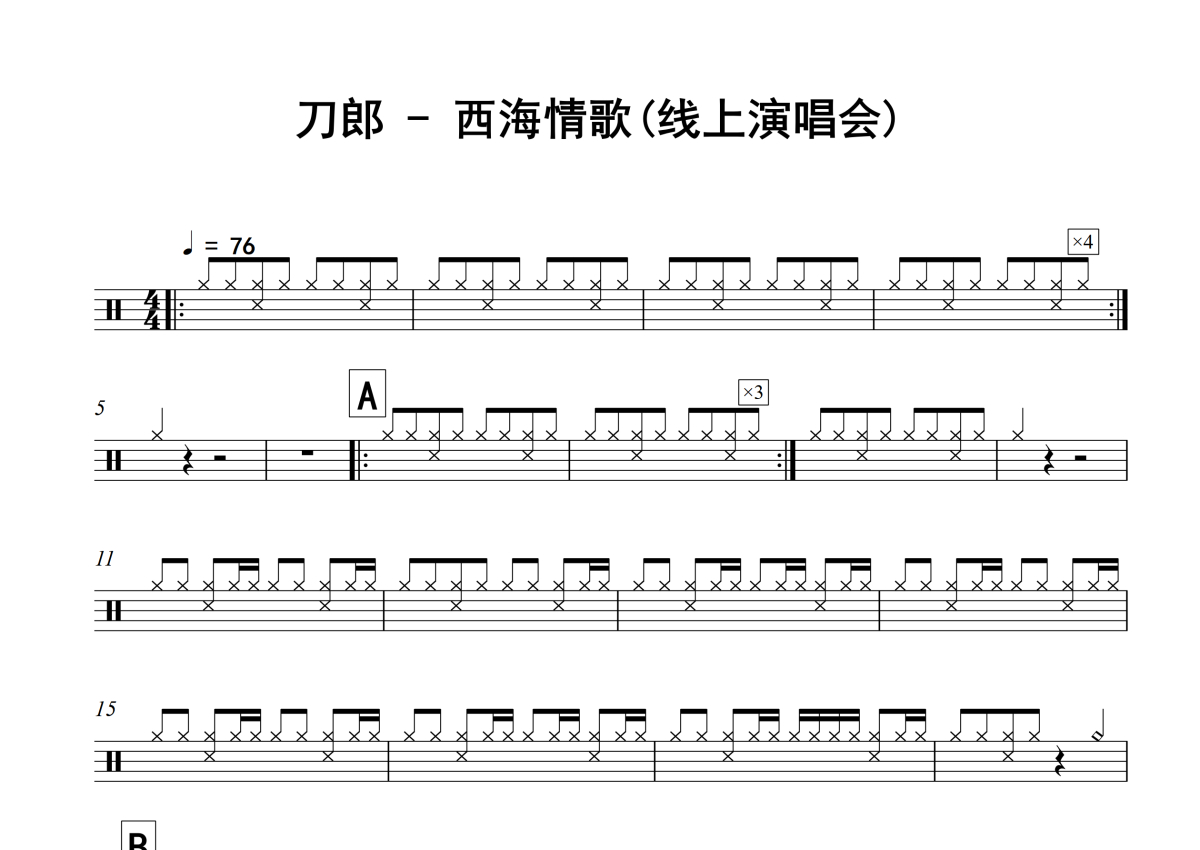 《西海情歌》是刀郎演唱的一首歌曲,线上演唱会,拍号为4/4拍,歌曲速度为每分钟76拍,这份架子鼓谱共有三张高清图谱,图谱由 @放晴的天空 编配上传,图谱使用五线谱编配,使用这份西海情歌架子鼓谱,你将能够轻松地敲打出这首刀郎的西海情歌,快来尝试吧。