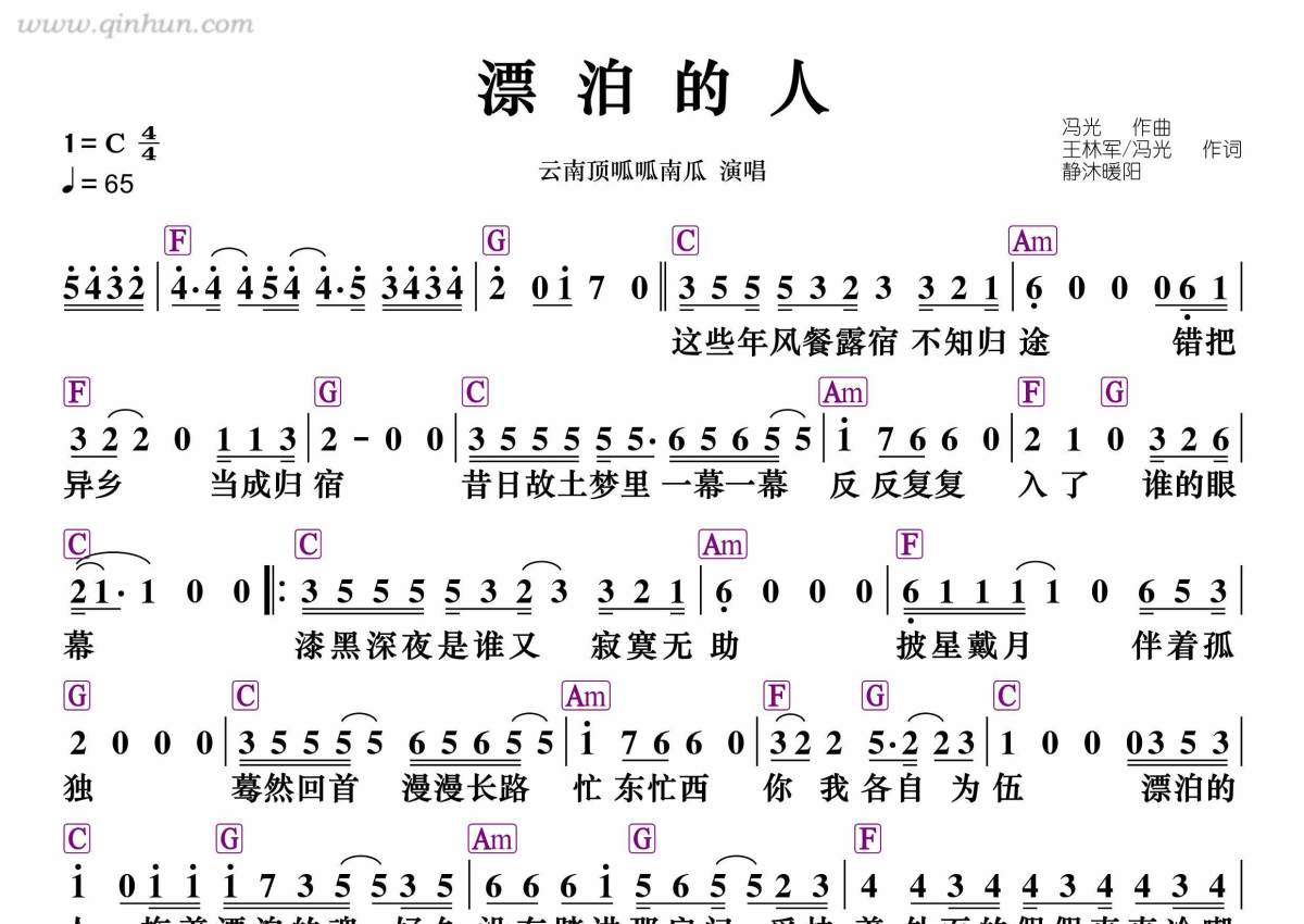 《漂泊的人》是云南顶呱呱南瓜演唱的一首歌曲,和弦谱,拍号为4/4拍,歌曲速度为每分钟65拍,这份简谱共有一张高清图谱,图谱由 @静沐暖阳 编配上传。