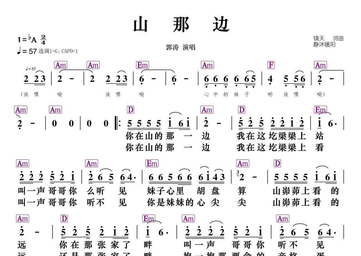 《山那边》是郭涛演唱的一首歌曲,和弦谱,拍号为2/4拍,歌曲速度为每分钟57拍,这份简谱共有一张高清图谱,图谱由 @静沐暖阳 编配上传。