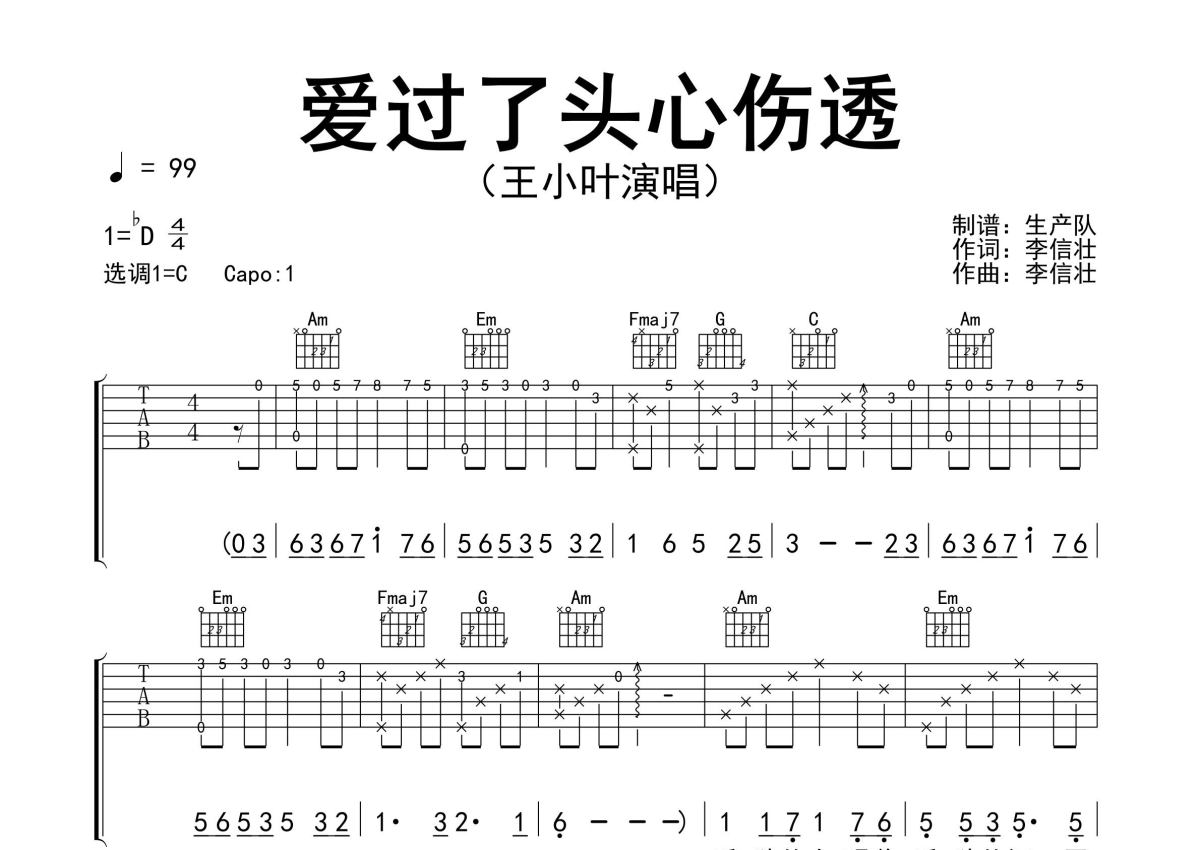 《爱过了头心伤透》是王小叶演唱的一首歌曲,精编完美版,拍号为4/4拍,歌曲速度为每分钟99拍,歌曲原调为Db调,但由于原调指法比较难,为了方便弹奏,本吉他谱采用的是C调指法编配,变调夹1品弹奏即为原调,当然也可以根据自己的音域改变变调夹位置,或者通过改变和弦调性,以方便自己弹奏,这份吉他谱共有三张高清图谱,图谱由 @生产队 编配上传,图谱使用六线谱编配,包含吉他和弦指法、简谱以及歌词部分,使用这份爱过了头心伤透吉他谱,可以让你更加方便地掌握这首歌曲的弹唱技巧,快来尝试吧。王小叶演唱的歌曲《爱过了头心伤透》原版吉他谱,完整的前奏、间奏、尾奏solo编配,精编完美版,值得推荐!。