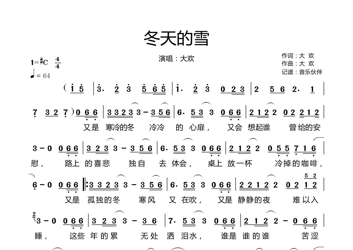 《冬天的雪》是大欢演唱的一首歌曲,拍号为4/4拍,歌曲速度为每分钟64拍,这份简谱共有一张高清图谱,图谱由 @音乐伙伴 编配上传。