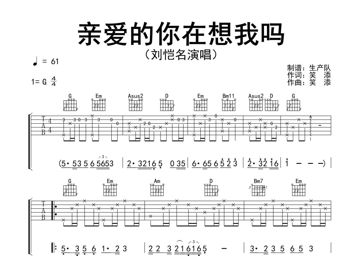 刘恺名《亲爱的你在想我吗》吉他谱 - G调弹唱六线谱 - 精编完美版