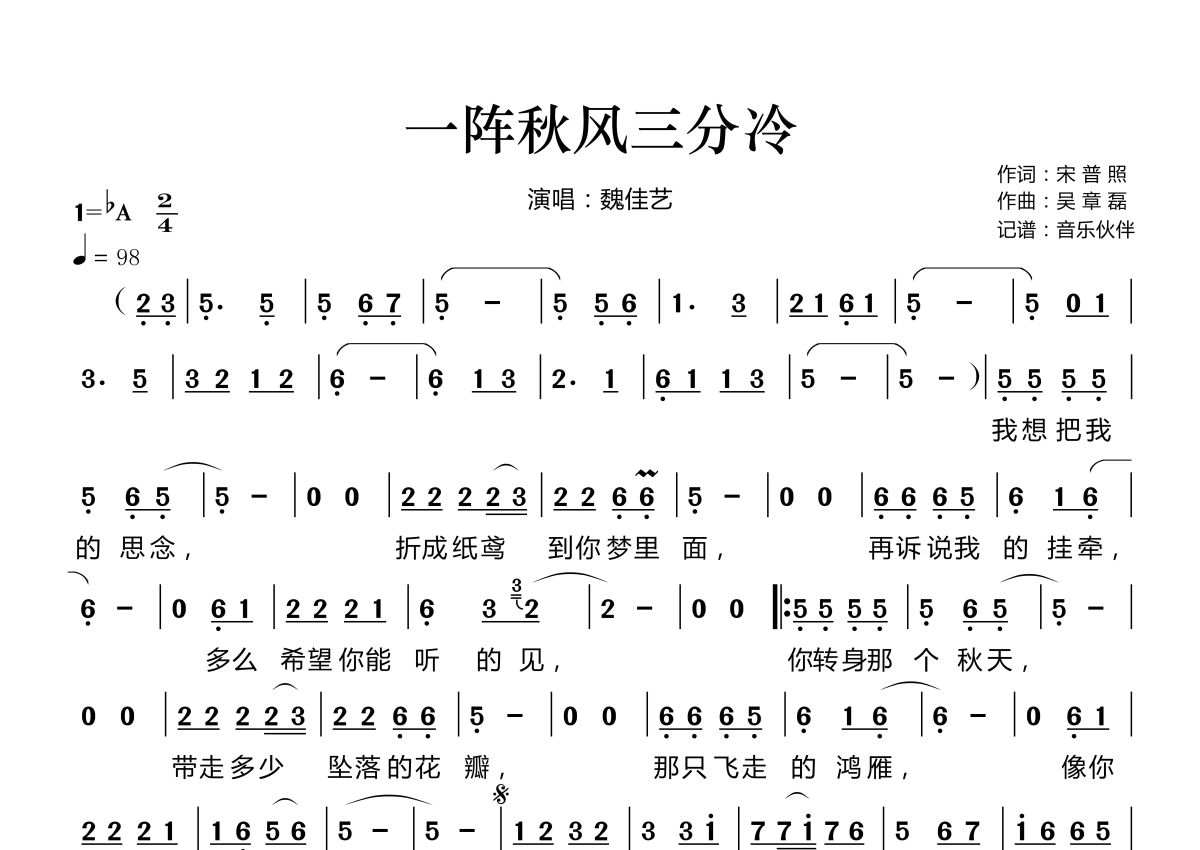 《一阵秋风三分冷》是魏佳艺演唱的一首歌曲,这份简谱共有一张高清图谱,图谱由 @音乐伙伴 编配上传。