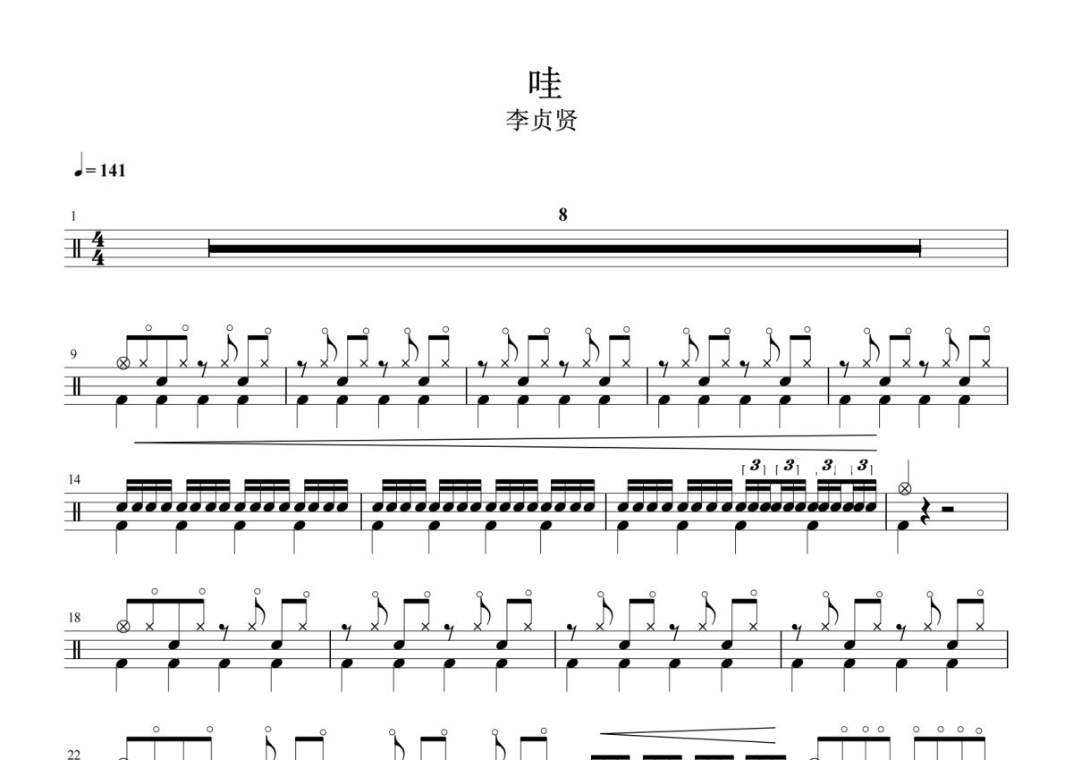 《哇》是李贞贤演唱的一首歌曲,拍号为4/4拍,歌曲速度为每分钟141拍,这份架子鼓谱共有三张高清图谱,图谱由 @举个例子 编配上传,图谱使用五线谱编配,使用这份哇架子鼓谱,你将能够轻松地敲打出这首李贞贤的哇,快来尝试吧。