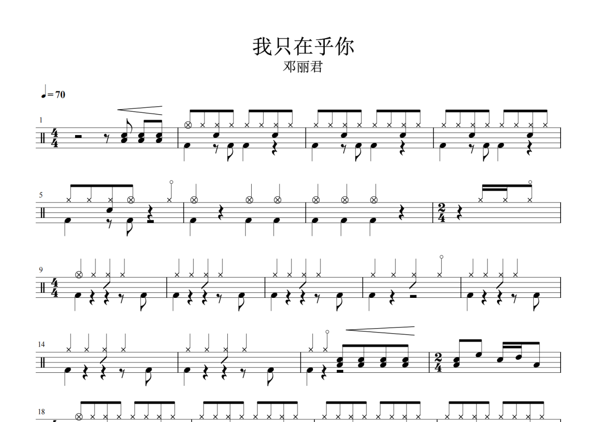 《我只在乎你》是邓丽君演唱的一首歌曲,拍号为4/4拍,歌曲速度为每分钟70拍,这份架子鼓谱共有两张高清图谱,图谱由 @举个例子 编配上传,图谱使用五线谱编配,使用这份我只在乎你架子鼓谱,你将能够轻松地敲打出这首邓丽君的我只在乎你,快来尝试吧。