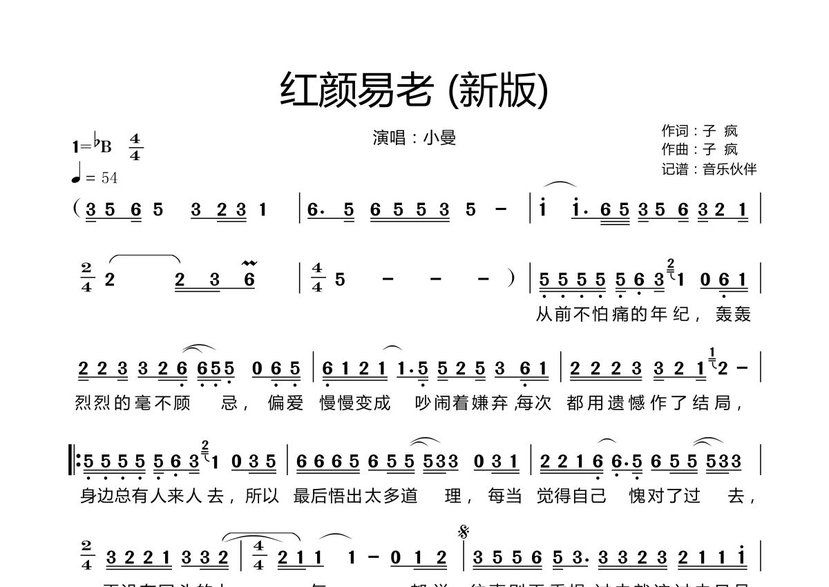《红颜易老》是小曼演唱的一首歌曲,新版,拍号为4/4拍,歌曲速度为每分钟54拍,这份简谱共有一张高清图谱,图谱由 @音乐伙伴 编配上传。