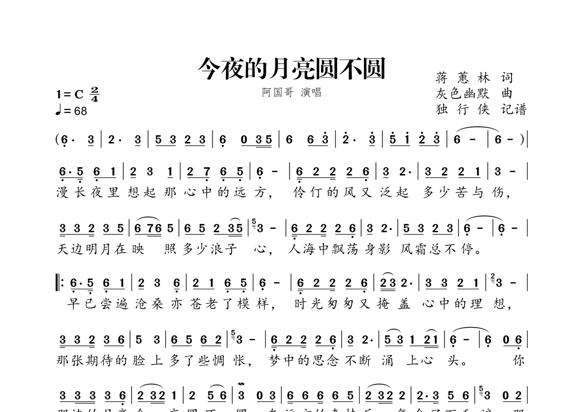 《今夜的月亮圆不圆》是阿国哥演唱的一首歌曲,拍号为2/4拍,歌曲速度为每分钟68拍,这份简谱共有一张高清图谱,图谱由 @独行侠 编配上传。