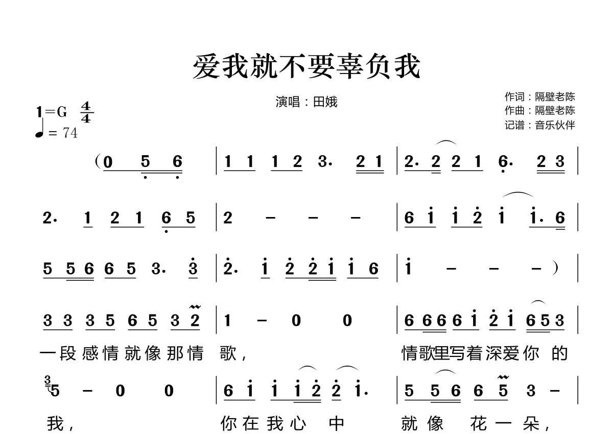 《爱我就不要辜负我》是田娥演唱的一首歌曲,这份简谱共有两张高清图谱,图谱由 @音乐伙伴 编配上传。