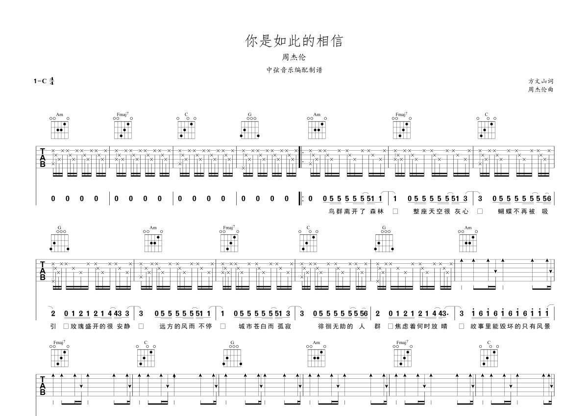《你是如此相信》是周杰伦演唱的一首歌曲,本吉他谱采用的是C调指法编配,这份吉他谱共有一张高清图谱,图谱由 @中弦音乐 编配上传,图谱使用六线谱编配,包含吉他和弦指法、简谱以及歌词部分,使用这份你是如此相信吉他谱,可以让你更加方便地掌握这首歌曲的弹唱技巧,快来尝试吧。《你是如此相信》,周杰伦为昆凌主演的电影《天·火》创作的主题曲,方文山一如既往意境绝美的歌词和周杰伦慵懒又富有张力的嗓音,让这首歌有了我们熟悉的味道。远处的太阳升起,生活就会充满希望,即使面对灾难,也要不畏艰难永不放弃。