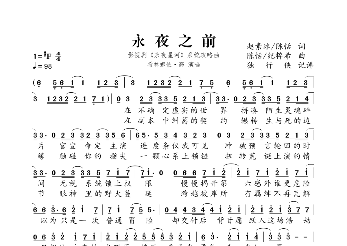 《永夜之前》是希林娜依·高演唱的一首歌曲,拍号为4/4拍,歌曲速度为每分钟98拍,这份简谱共有一张高清图谱,图谱由 @独行侠 编配上传。