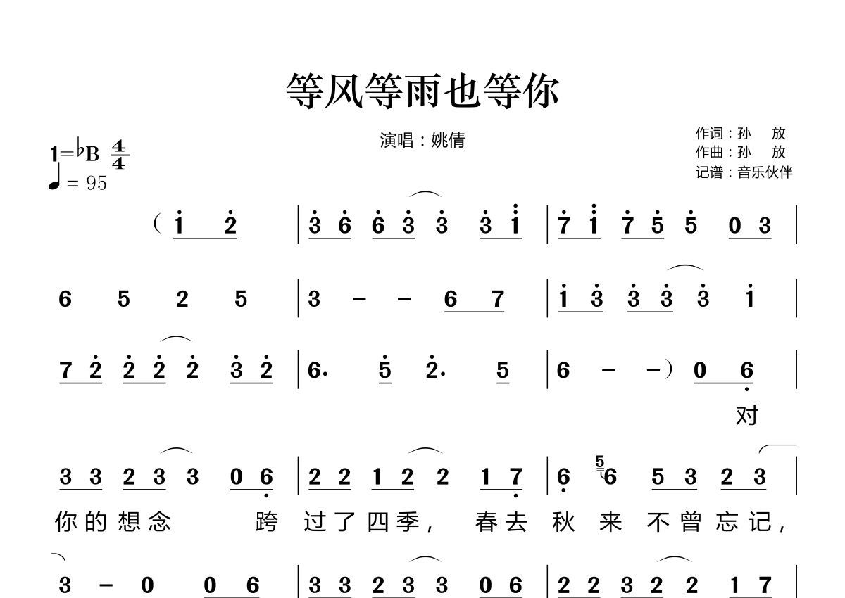 《等风等雨也等你》是姚倩演唱的一首歌曲,这份简谱共有两张高清图谱,图谱由 @音乐伙伴 编配上传。