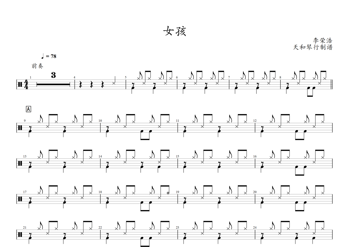 李荣浩《女孩》架子鼓谱