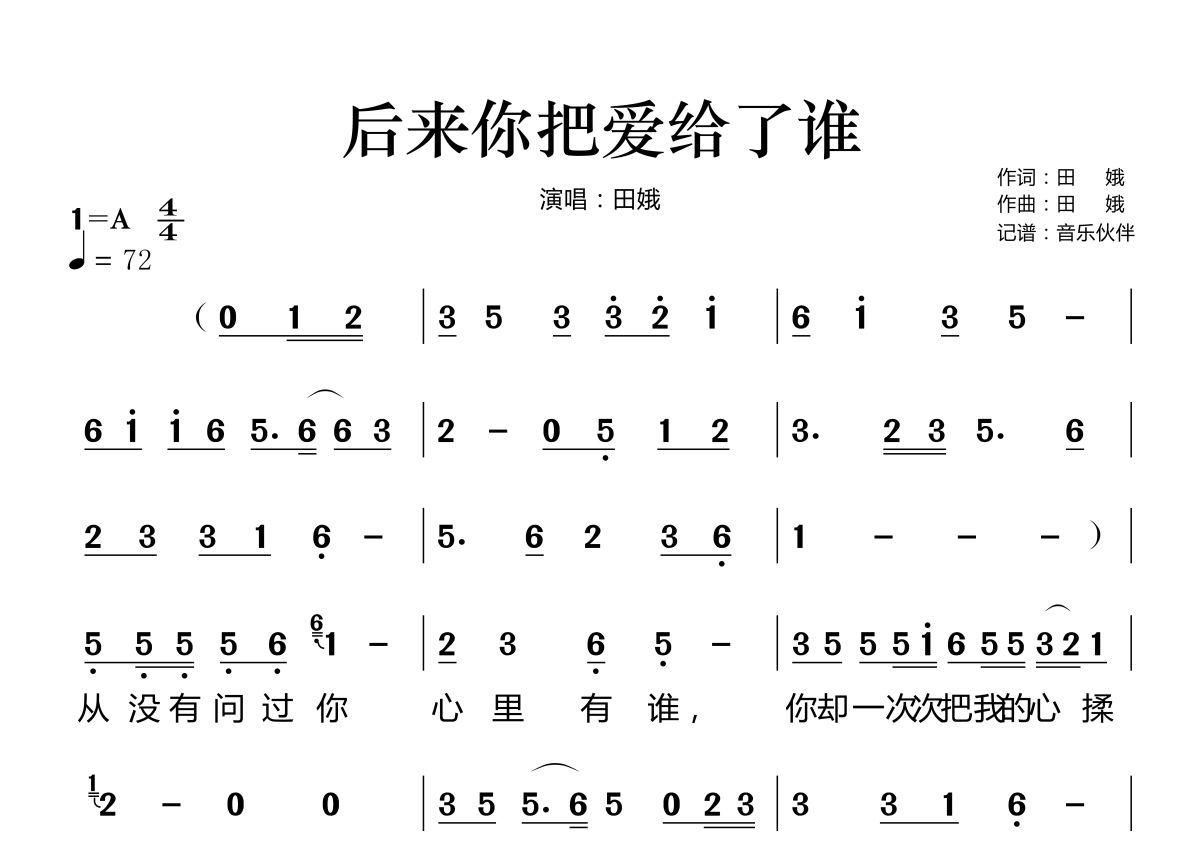 后来你把爱给了谁简谱 - 田娥演唱