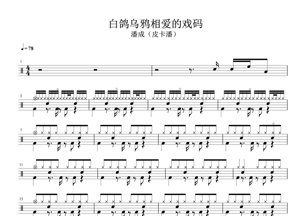 《白鸽乌鸦相爱的戏码》是潘成演唱的一首歌曲,拍号为4/4拍,歌曲速度为每分钟78拍,这份架子鼓谱共有两张高清图谱,图谱由 @失眠的土豆 编配上传,图谱使用五线谱编配,使用这份白鸽乌鸦相爱的戏码架子鼓谱,你将能够轻松地敲打出这首潘成的白鸽乌鸦相爱的戏码,快来尝试吧。