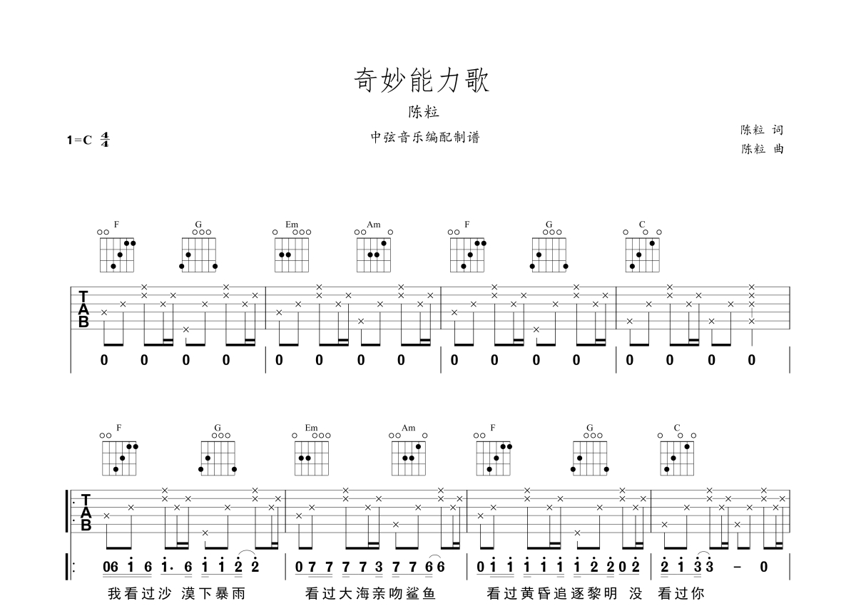 《奇妙能力歌》是陈粒演唱的一首歌曲,本吉他谱采用的是C调指法编配,这份吉他谱共有两张高清图谱,图谱由 @中弦音乐 编配上传,图谱使用六线谱编配,包含吉他和弦指法、简谱以及歌词部分,使用这份奇妙能力歌吉他谱,可以让你更加方便地掌握这首歌曲的弹唱技巧,快来尝试吧。奇妙能力歌吉他谱,一首好听的民谣歌曲,歌词营造的意境让人产生情感的共鸣,娓娓道来的歌声平淡质朴,仿佛一个少女在安静一隅回忆往事,如浅饮清酒一般越来越有风味。