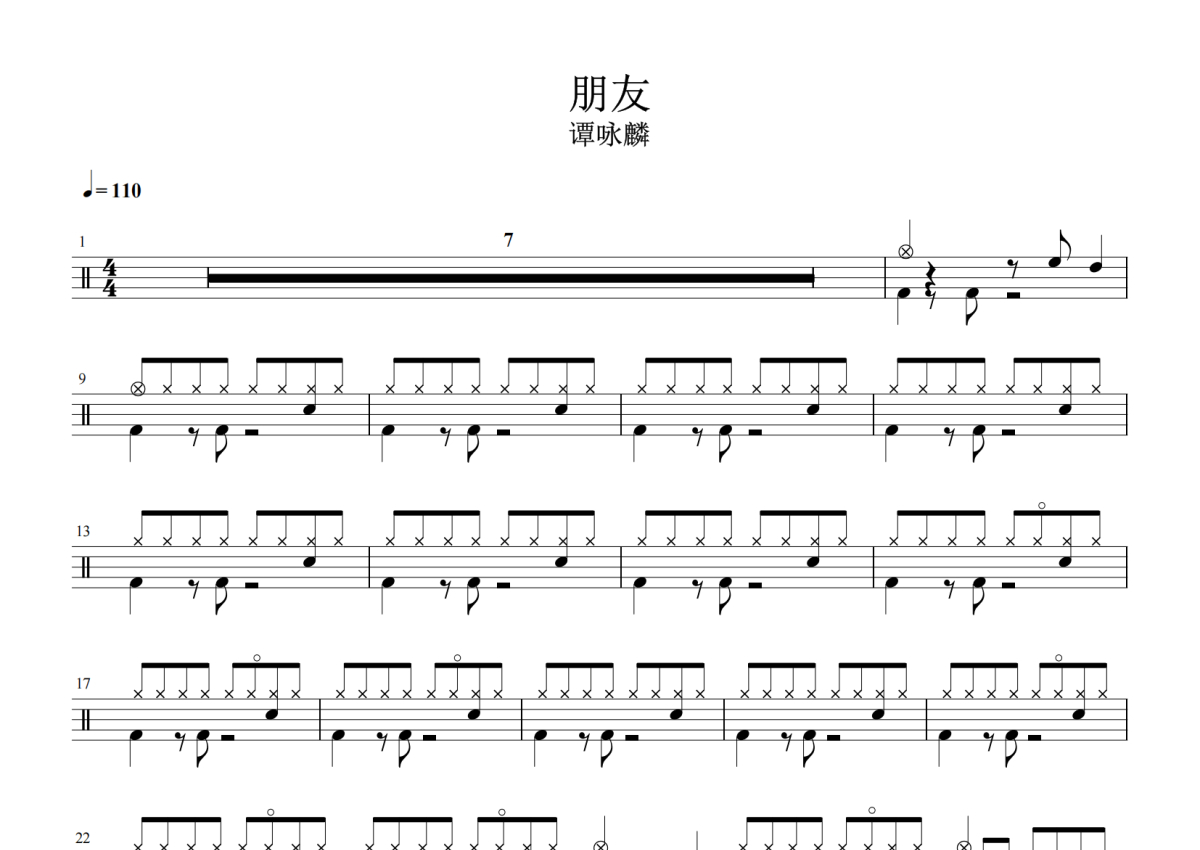 《朋友》是谭咏麟演唱的一首歌曲,拍号为4/4拍,歌曲速度为每分钟110拍,这份架子鼓谱共有三张高清图谱,图谱由 @失眠的土豆 编配上传,图谱使用五线谱编配,使用这份朋友架子鼓谱,你将能够轻松地敲打出这首谭咏麟的朋友,快来尝试吧。