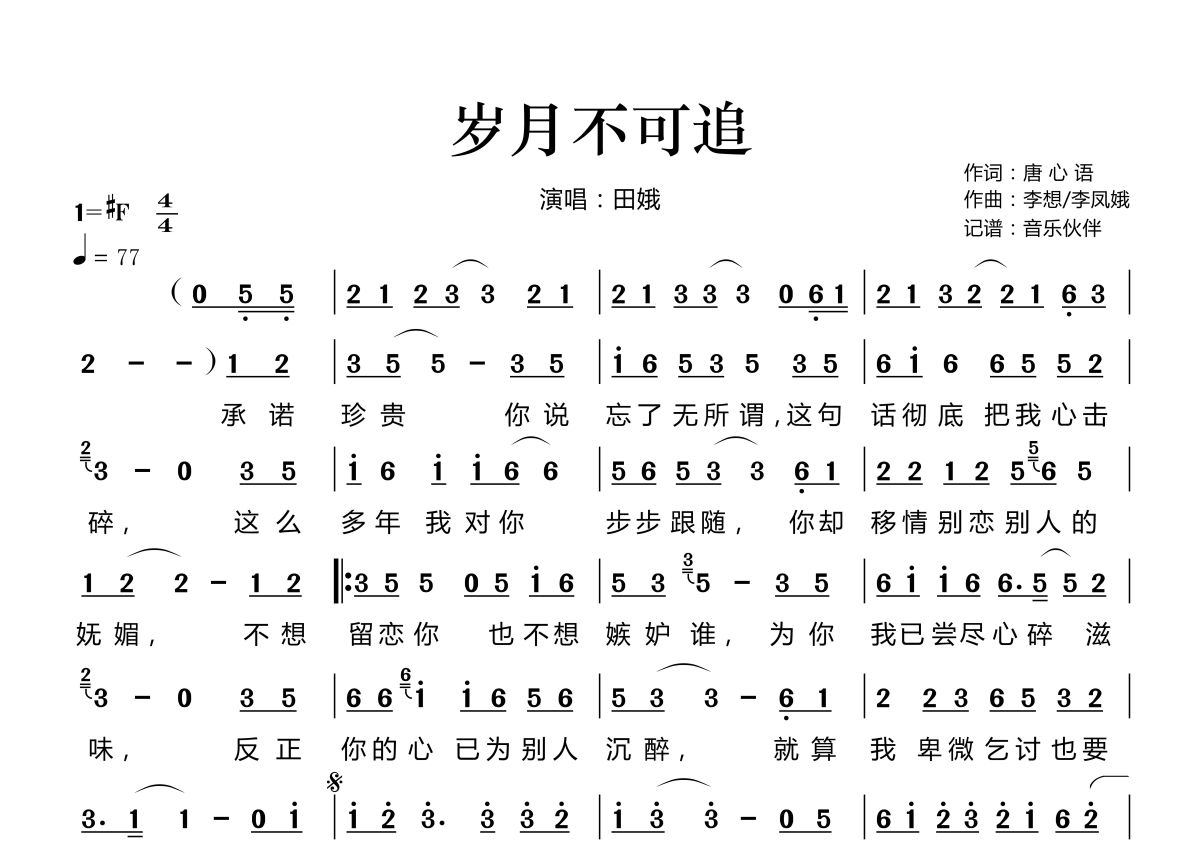 《岁月不可追》是田娥演唱的一首歌曲,这份简谱共有一张高清图谱,图谱由 @音乐伙伴 编配上传。