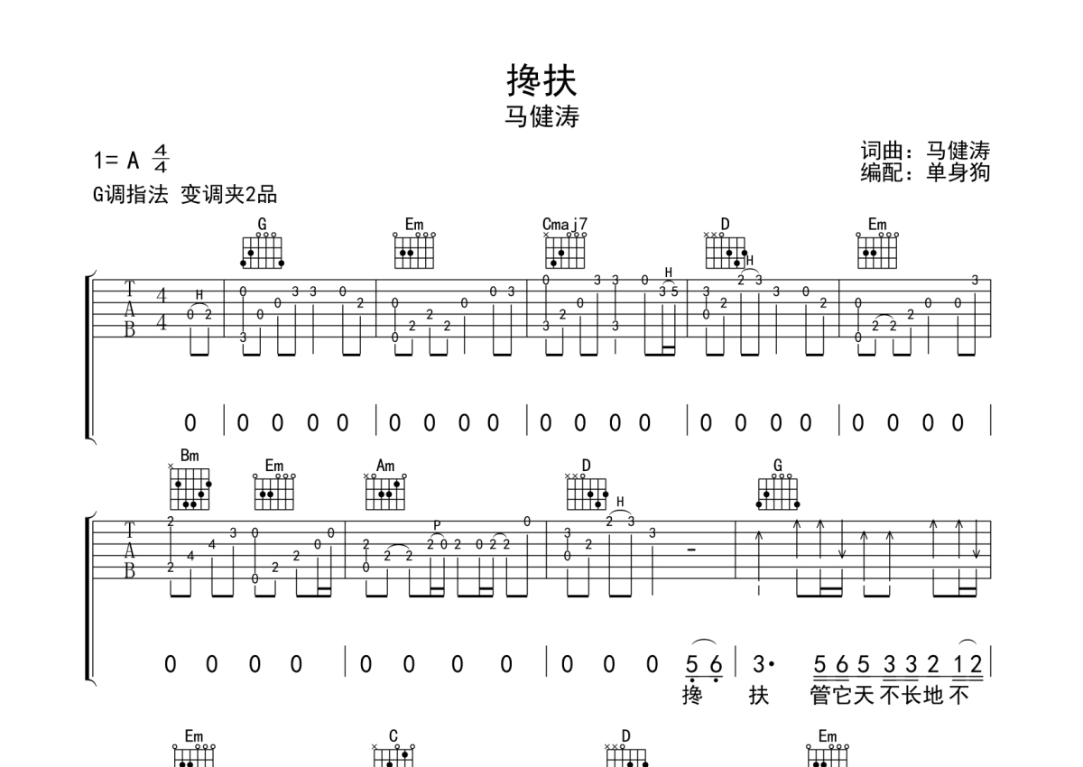 《搀扶》吉他谱 - 马健涛 - G调弹唱六线谱