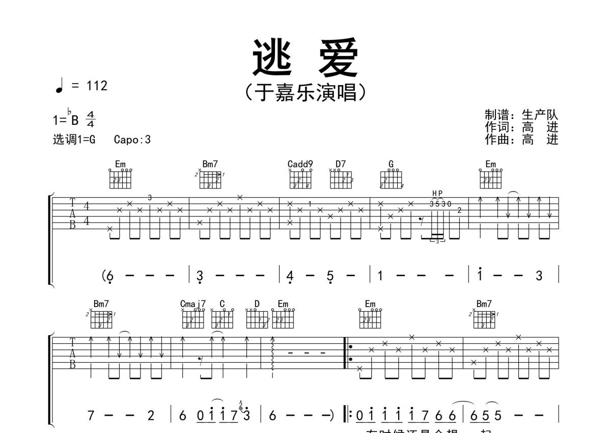 《逃爱》是于嘉乐演唱的一首歌曲,精编完美版,拍号为4/4拍,歌曲速度为每分钟112拍,歌曲原调为G调,本吉他谱采用的是G调指法编配,变调夹3品弹奏即为原调,当然也可以根据自己的音域改变变调夹位置,或者通过改变和弦调性,以方便自己弹奏,这份吉他谱共有三张高清图谱,图谱由 @生产队 编配上传,图谱使用六线谱编配,包含吉他和弦指法、简谱以及歌词部分,使用这份逃爱吉他谱,可以让你更加方便地掌握这首歌曲的弹唱技巧,快来尝试吧。于嘉乐演唱的经典歌曲《逃爱》原版吉他谱,完整的前奏、间奏、尾奏solo编配,精编完美版,怀旧经典!。