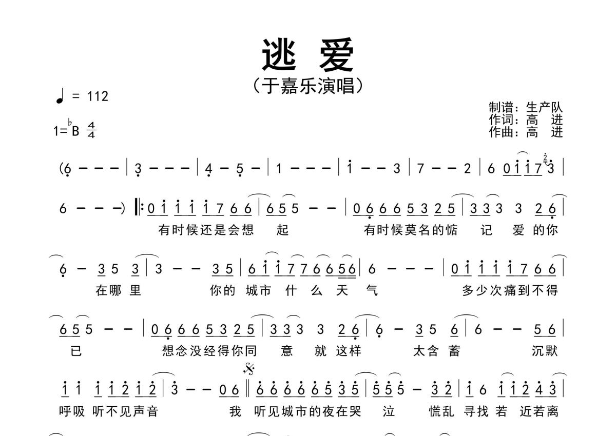 《逃爱》是于嘉乐演唱的一首歌曲,原版简谱,拍号为4/4拍,歌曲速度为每分钟112拍,这份简谱共有一张高清图谱,图谱由 @生产队 编配上传于嘉乐演唱的经典歌曲《逃爱》原版简谱,完整的前奏、间奏、尾奏solo编配。