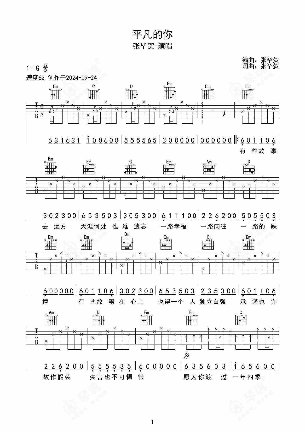 《平凡的你》是张毕贺演唱的一首歌曲,初级扫弦学习者,拍号为6/8拍,歌曲速度为每分钟62拍,歌曲原调为G调,本吉他谱采用的是G调指法编配,演奏时不需要使用变调夹即为原调,这份吉他谱共有两张高清图谱,图谱由 @张毕贺 编配上传,图谱使用六线谱编配,包含吉他和弦指法、简谱以及歌词部分,曲谱配备了相关的音频提供试听,使用这份平凡的你吉他谱,可以让你更加方便地掌握这首歌曲的弹唱技巧,快来尝试吧。作品(平凡的你)出自张毕贺2024年精选单曲歌曲表达一切的平凡的自己做平凡的事情。