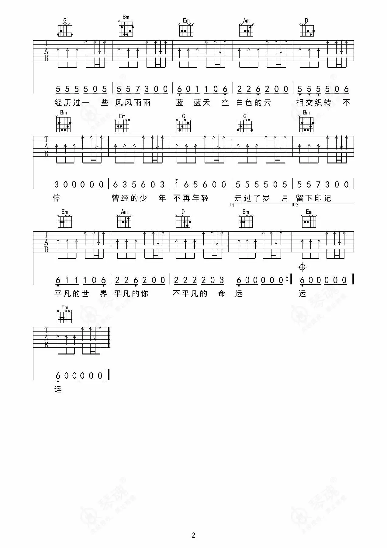 张毕贺《平凡的你》吉他谱 - G调弹唱六线谱 - 初级扫弦学习者