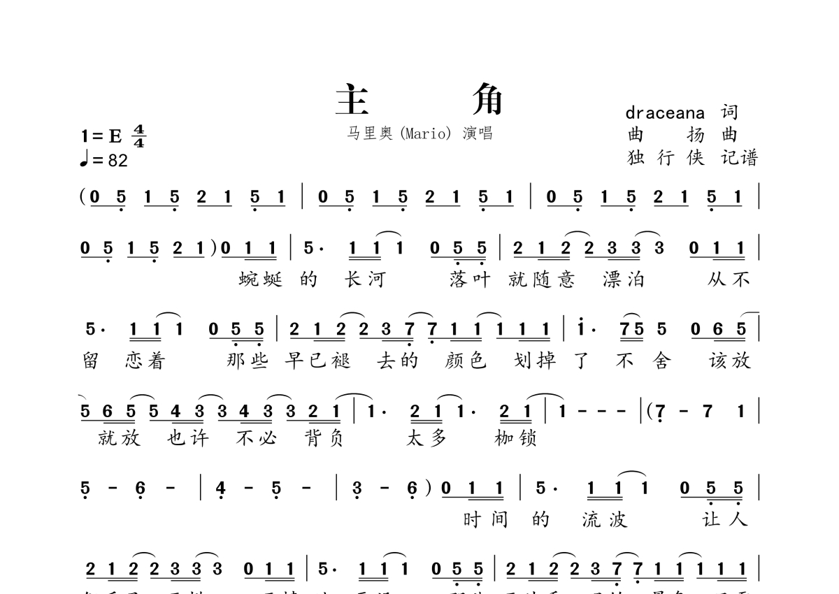 《主角》是马里奥 (Mario)演唱的一首歌曲,拍号为4/4拍,歌曲速度为每分钟82拍,这份简谱共有两张高清图谱,图谱由 @独行侠 编配上传。
