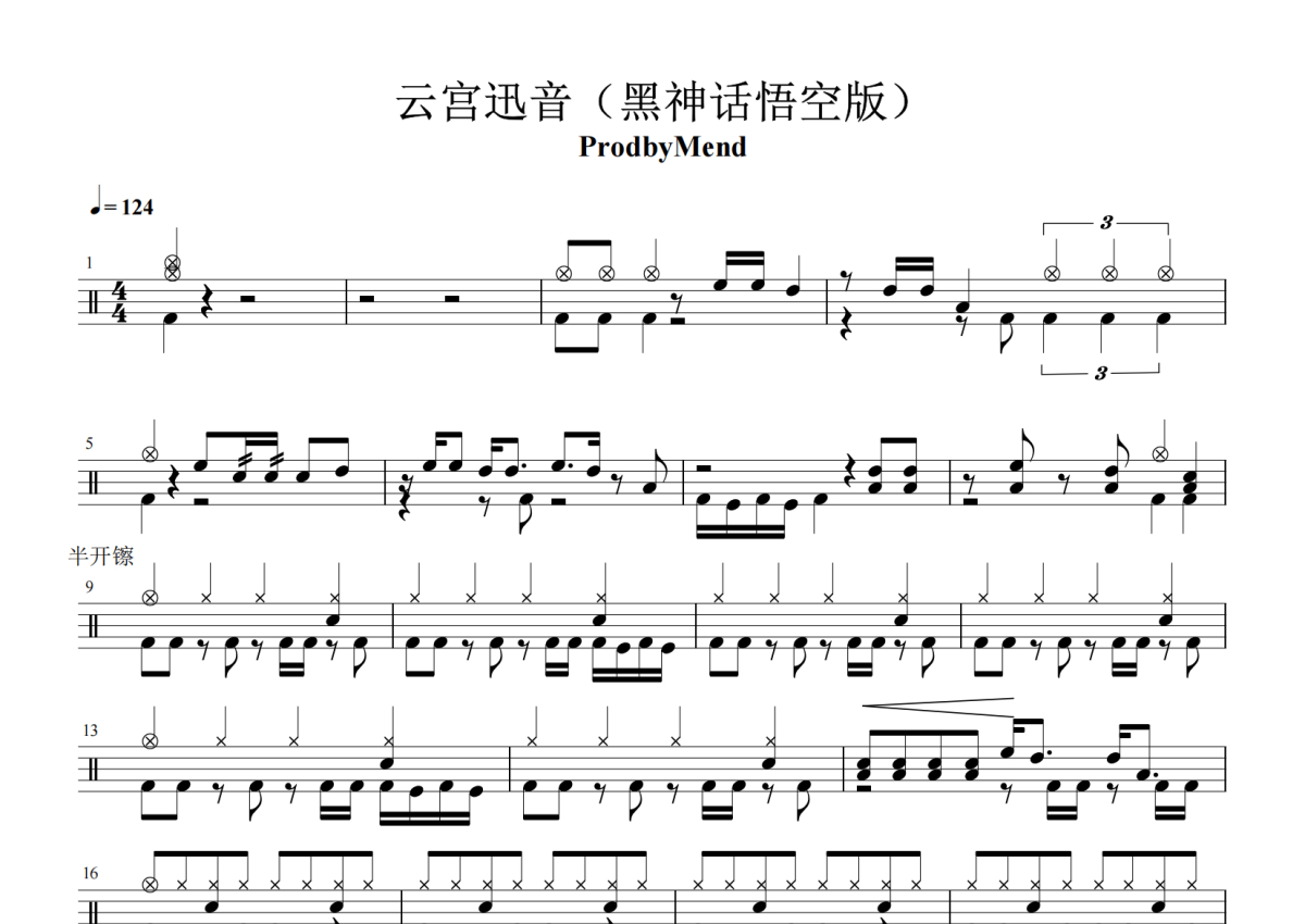 《云宫迅音》是黑神话悟空演唱的一首歌曲,拍号为4/4拍,歌曲速度为每分钟124拍,这份架子鼓谱共有两张高清图谱,图谱由 @庄颜 编配上传,图谱使用五线谱编配,使用这份云宫迅音架子鼓谱,你将能够轻松地敲打出这首黑神话悟空的云宫迅音,快来尝试吧。
