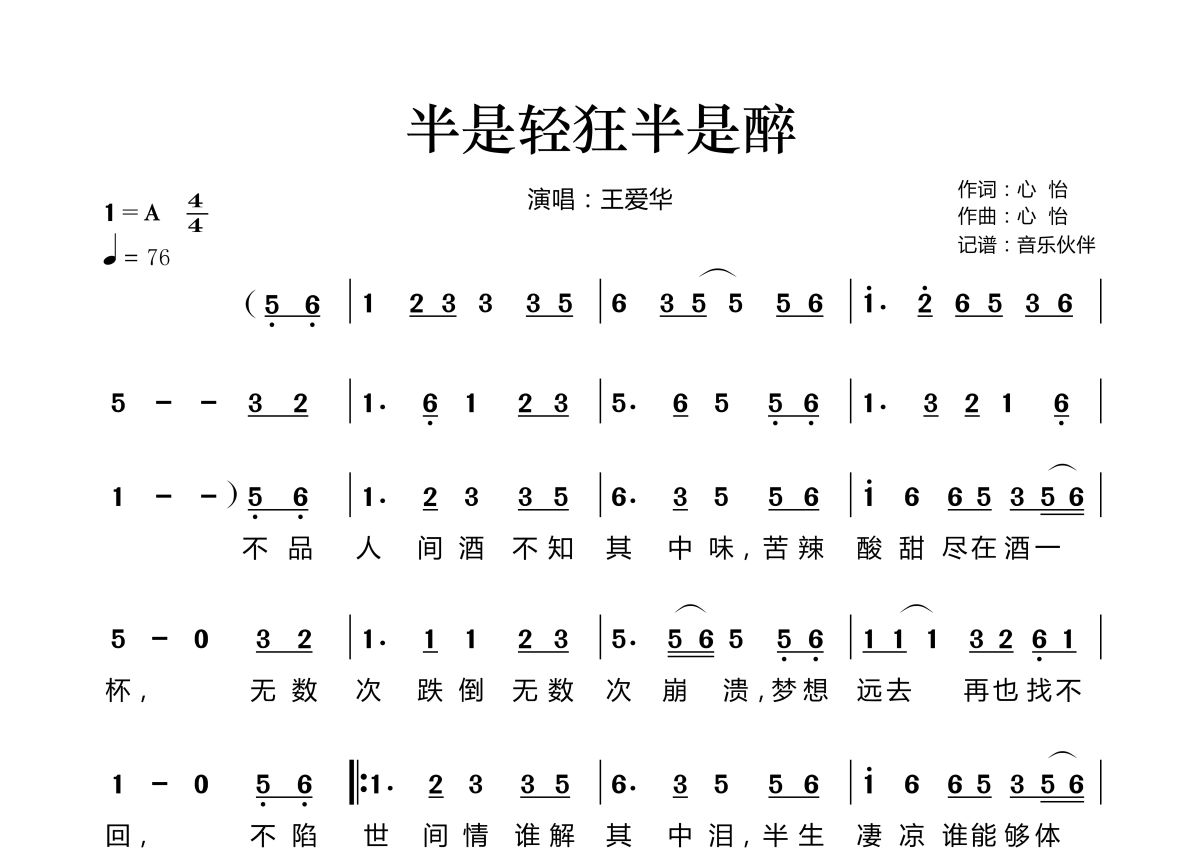《半是轻狂半是醉》是王爱华演唱的一首歌曲,拍号为4/4拍,歌曲速度为每分钟76拍,这份简谱共有两张高清图谱,图谱由 @音乐伙伴 编配上传。