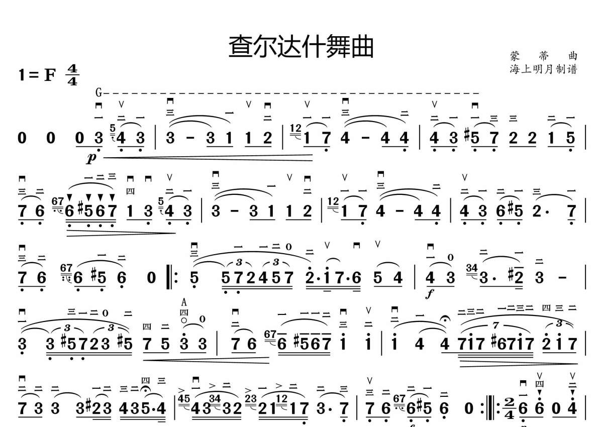《查尔达什舞曲》是蒙蒂演唱的一首歌曲,简谱版,拍号为4/4拍,这份小提琴谱共有两张高清图谱,图谱由 @海上明月 编配上传。