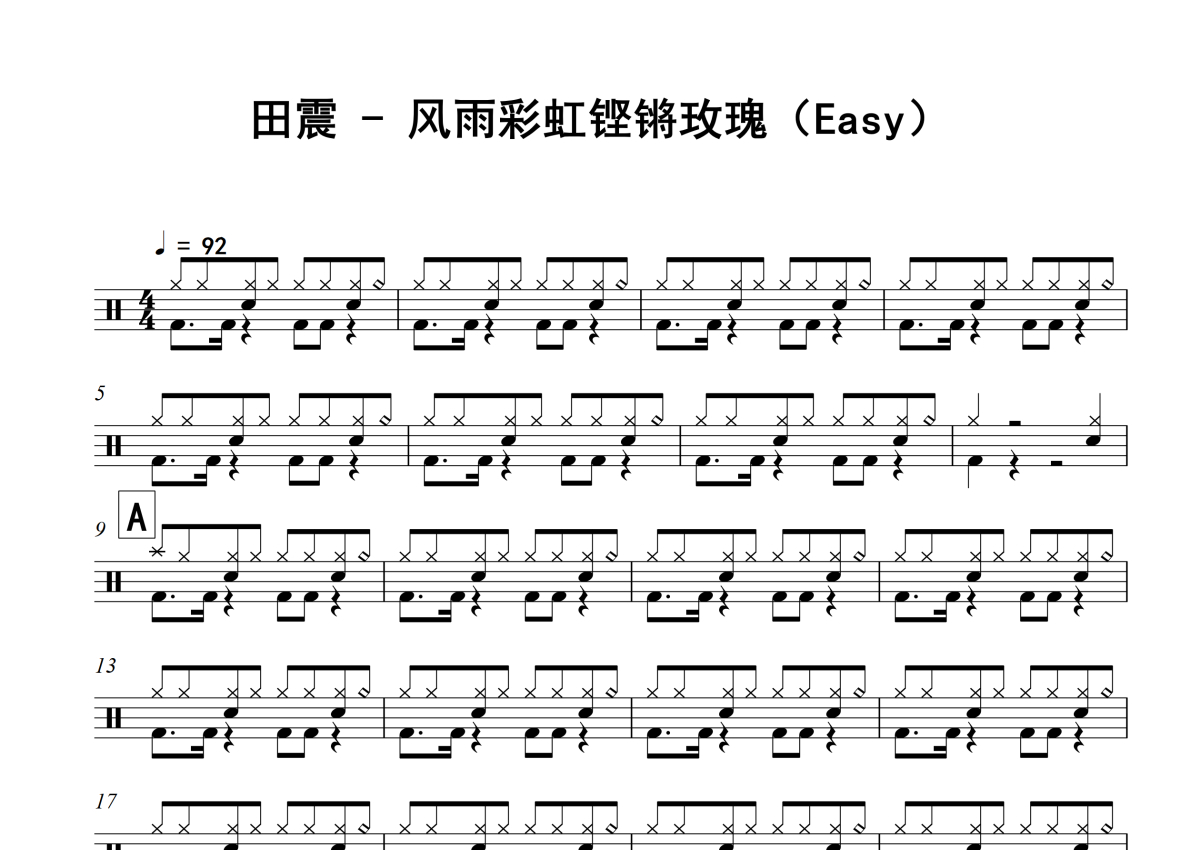 《风雨彩虹铿锵玫瑰》是田震演唱的一首歌曲,Easy,拍号为4/4拍,歌曲速度为每分钟92拍,这份架子鼓谱共有两张高清图谱,图谱由 @放晴的天空 编配上传,图谱使用五线谱编配,使用这份风雨彩虹铿锵玫瑰架子鼓谱,你将能够轻松地敲打出这首田震的风雨彩虹铿锵玫瑰,快来尝试吧。