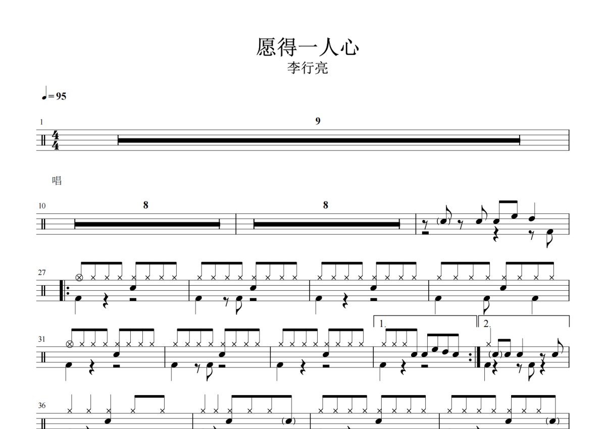 李行亮《愿得一人心》架子鼓谱