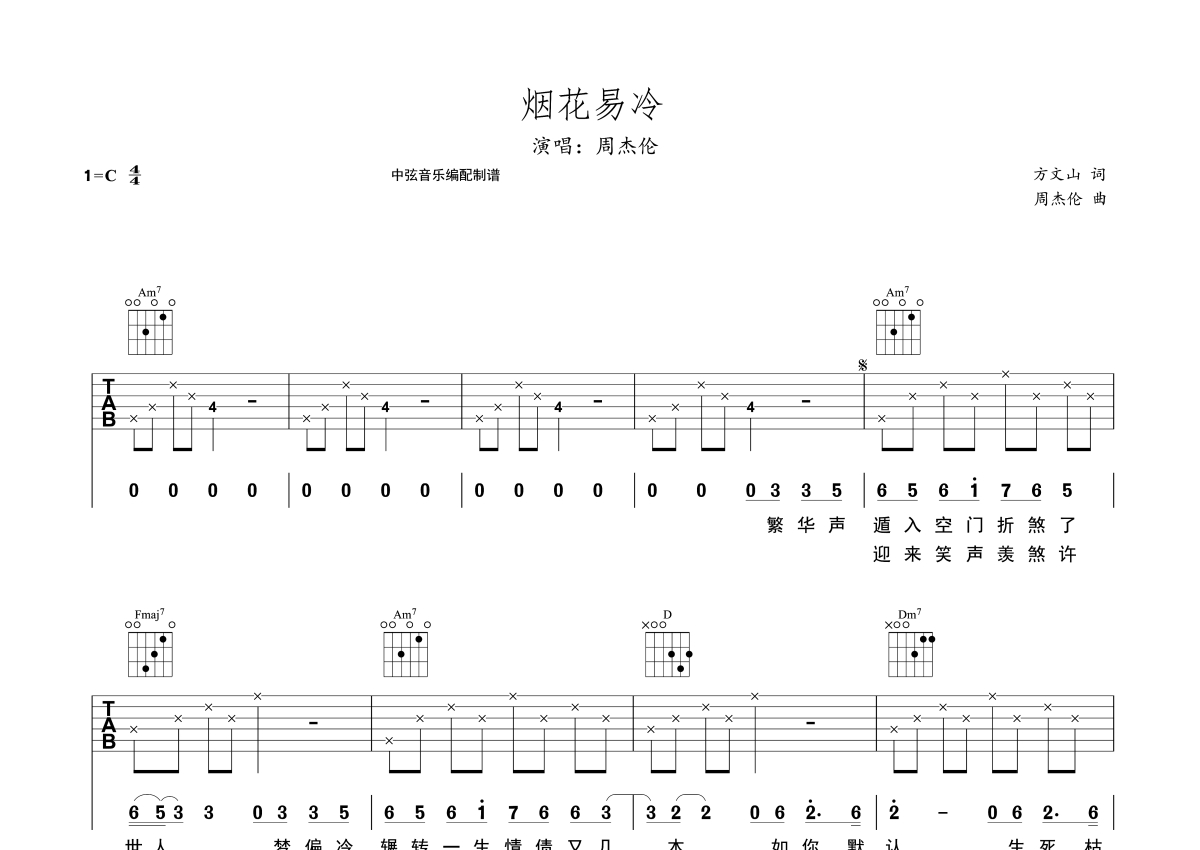 周杰伦《烟花易冷》吉他谱 - C调弹唱六线谱