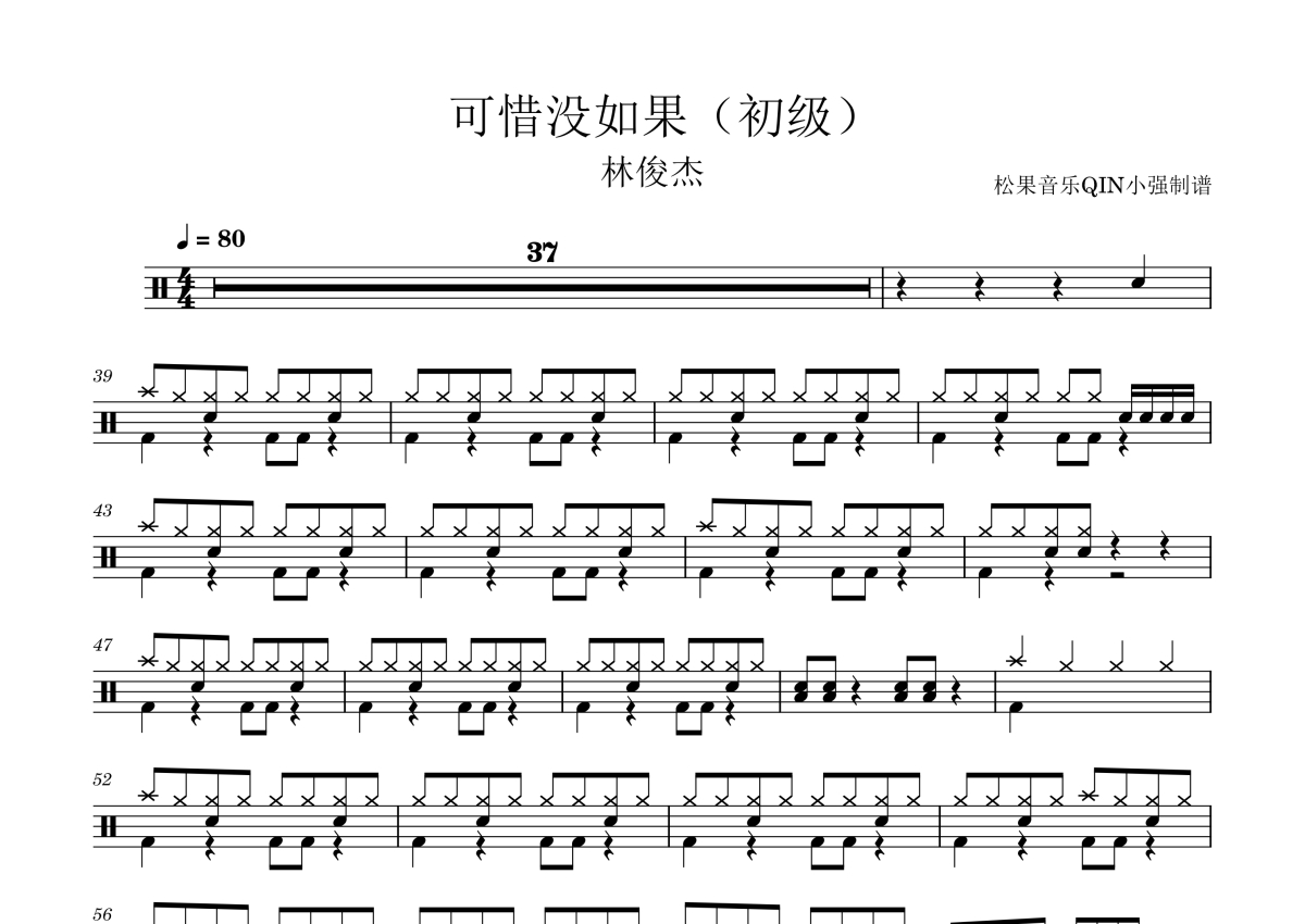 《可惜没如果》是林俊杰演唱的一首歌曲,拍号为4/4拍,这份架子鼓谱共有两张高清图谱,图谱由 @松果音乐QIN小强 编配上传,图谱使用五线谱编配,使用这份可惜没如果架子鼓谱,你将能够轻松地敲打出这首林俊杰的可惜没如果,快来尝试吧。歌曲《可惜没如果》,由林俊杰作曲并演唱,林夕作词,蔡政勋编曲,收录在林俊杰第11张个人专辑《新地球GENESIS》中,是专辑的首波抒情主打,同时也是韩剧《杜鹃之巢》的中文主题曲、《对我而言,可爱的她》的中文片尾曲。