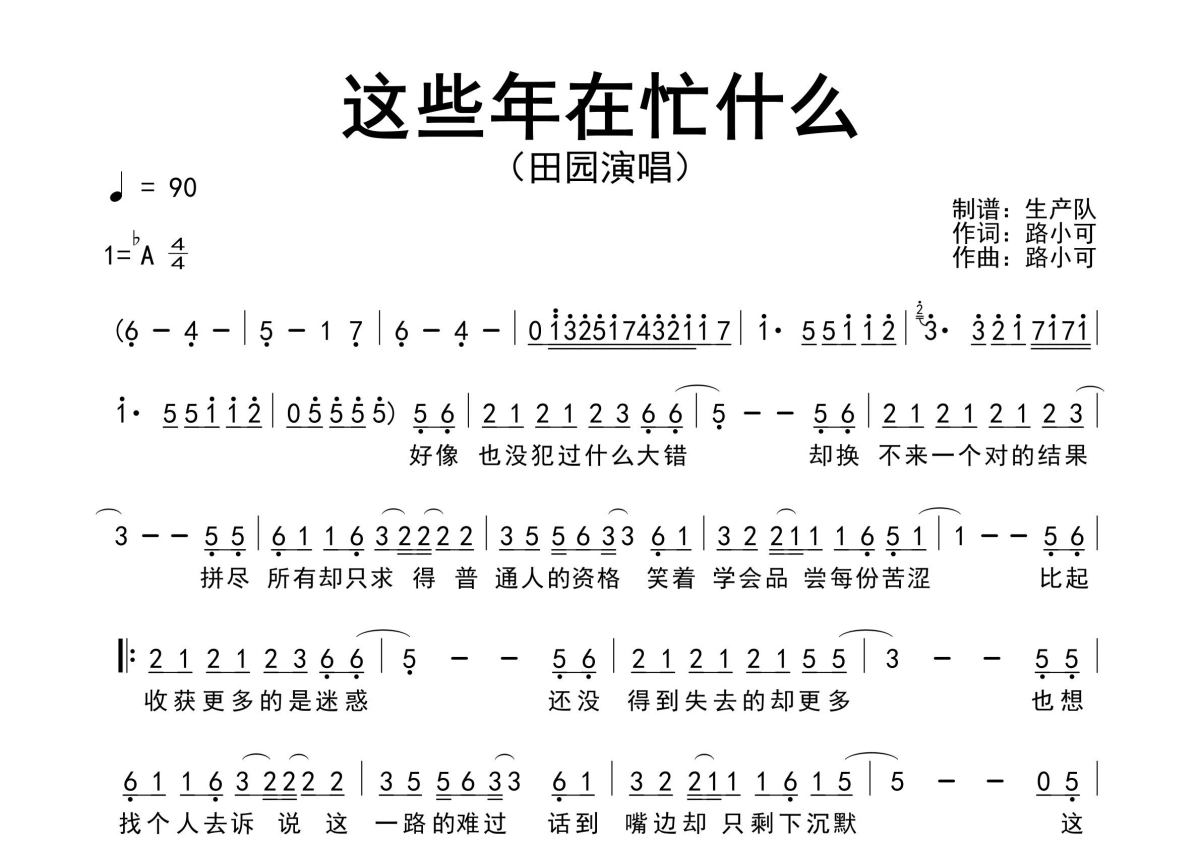 《这些年在忙什么》是田园演唱的一首歌曲,原版简谱,拍号为4/4拍,歌曲速度为每分钟90拍,这份简谱共有一张高清图谱,图谱由 @生产队 编配上传田园演唱的歌曲《这些年在忙什么》原版简谱,完整的前奏、间奏、尾奏solo编配。