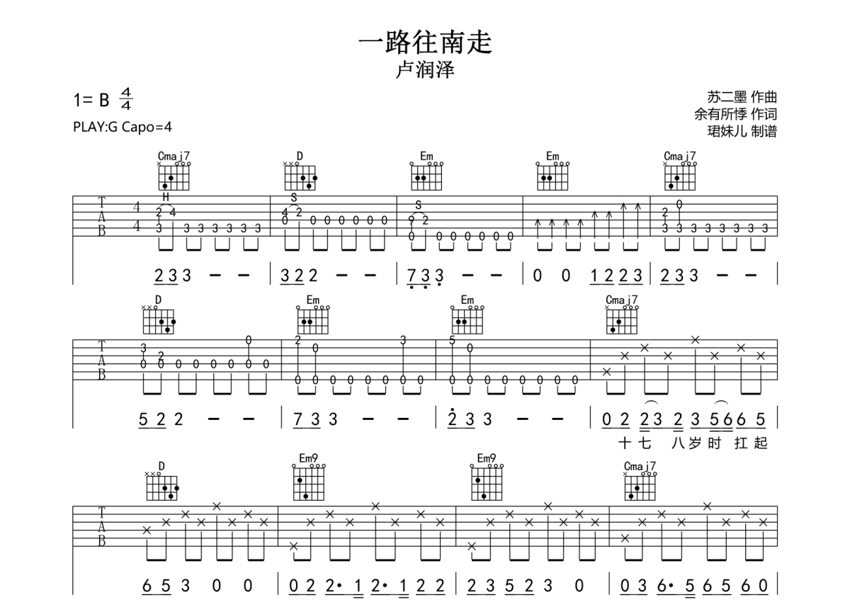 卢润泽《一路往南走》吉他谱 - G调弹唱六线谱