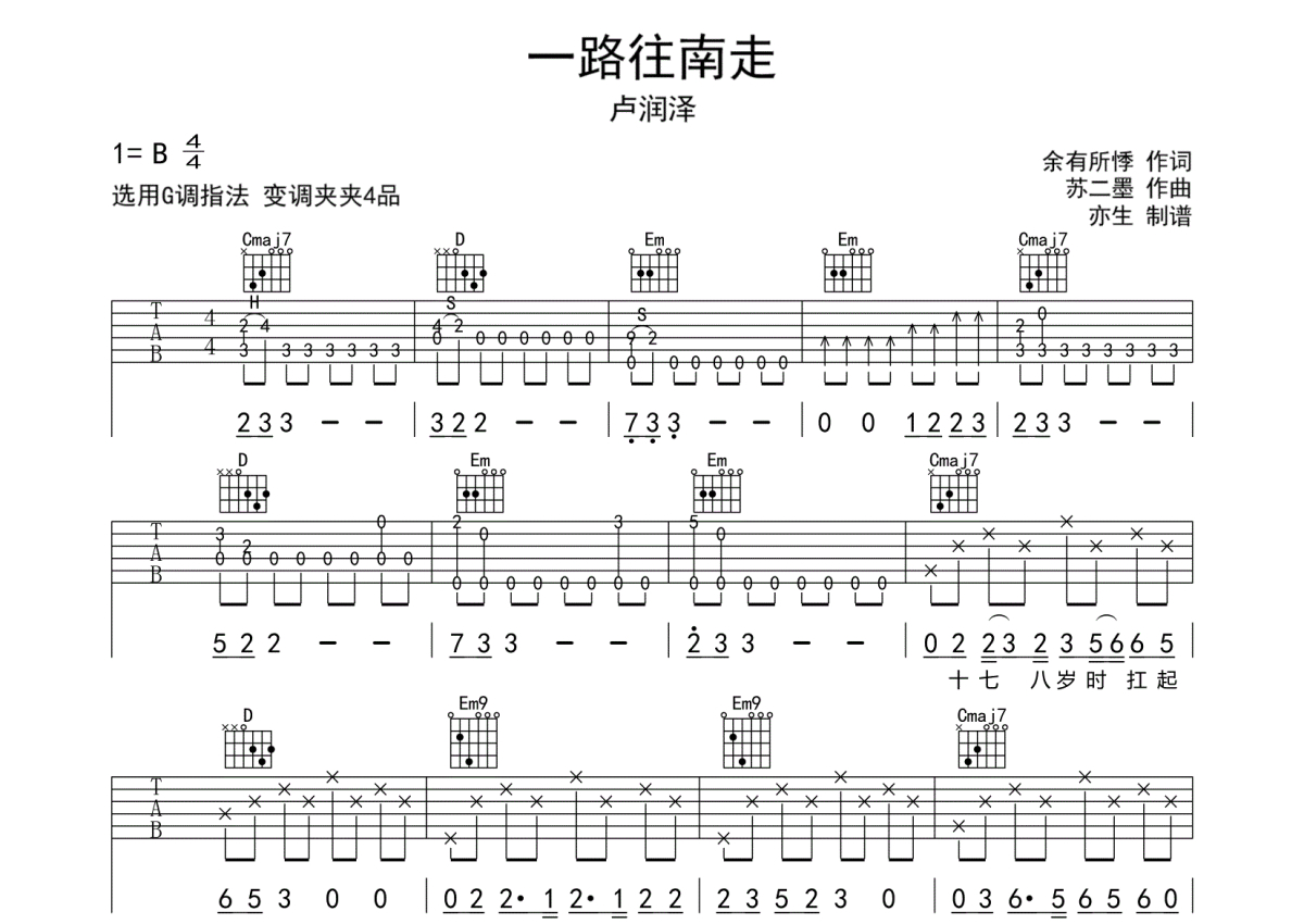 《一路往南走》是卢润泽演唱的一首歌曲,拍号为4/4拍,歌曲原调为B调,但由于原调指法比较难,为了方便弹奏,本吉他谱采用的是G调指法编配,变调夹4品弹奏即为原调,当然也可以根据自己的音域改变变调夹位置,或者通过改变和弦调性,以方便自己弹奏,这份吉他谱共有两张高清图谱,图谱由 @亦生 编配上传,图谱使用六线谱编配,包含吉他和弦指法、简谱以及歌词部分,使用这份一路往南走吉他谱,可以让你更加方便地掌握这首歌曲的弹唱技巧,快来尝试吧。