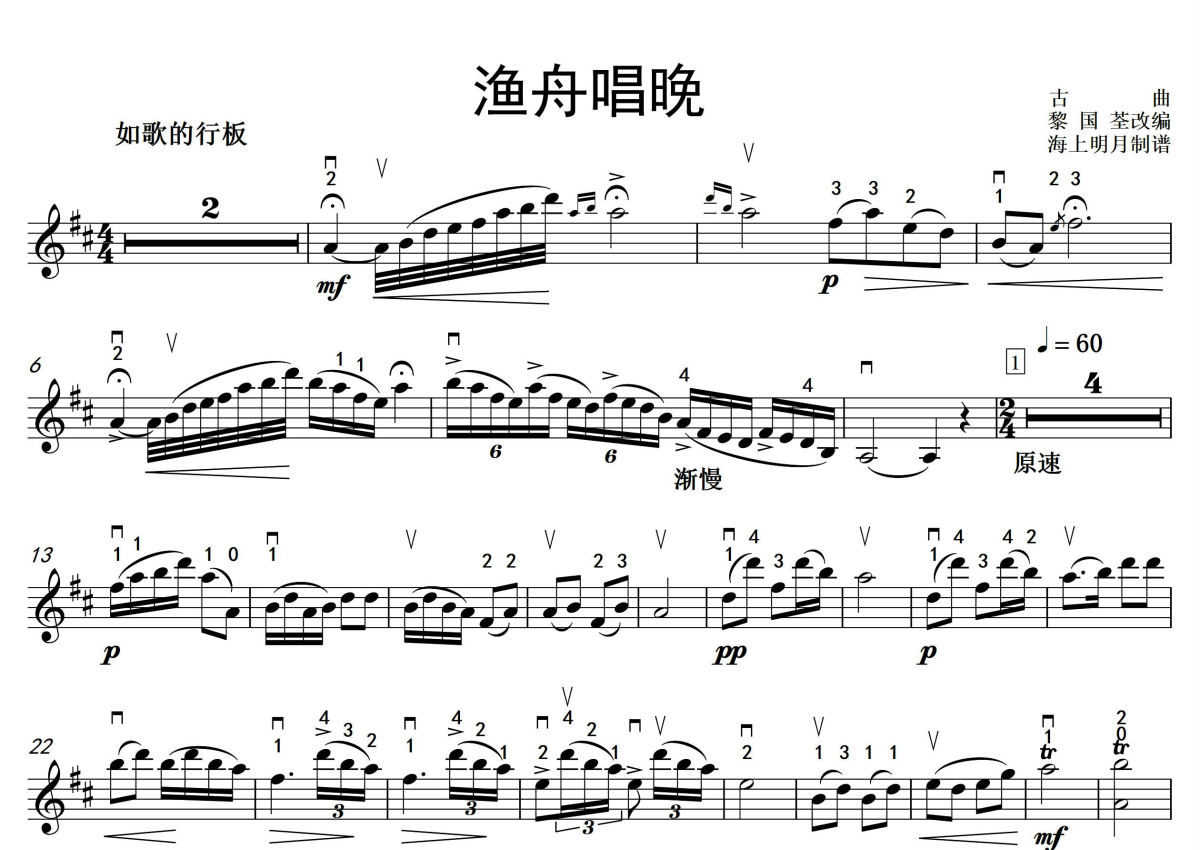 黎国荃改编《渔舟唱晚》小提琴谱
